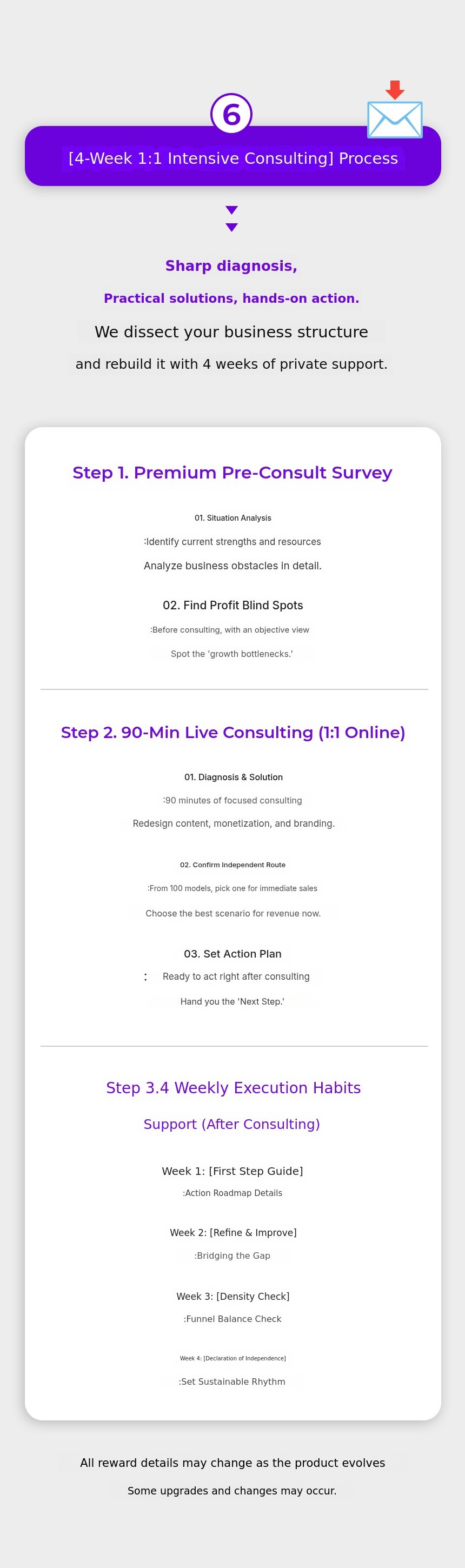 This consulting is operated with the goal of 'monetization within 3 months.'To achieve this goal, participants must adhere to the following principles. Failure to do so may delay or hinder the achievement of the goal. In addition, if you are absent without prior notice, become unreachable, or miss assignments, your consulting rights may be forfeited.