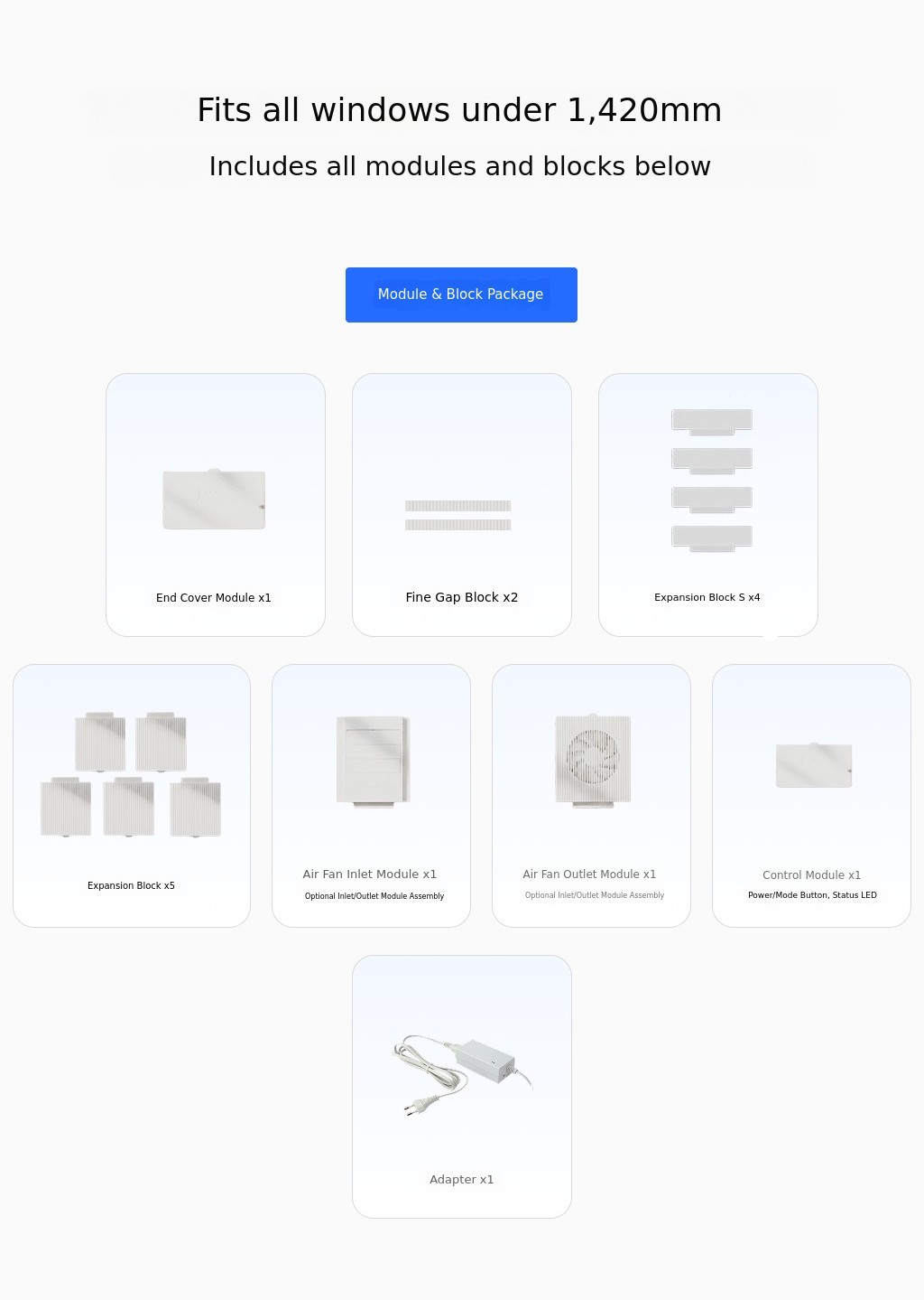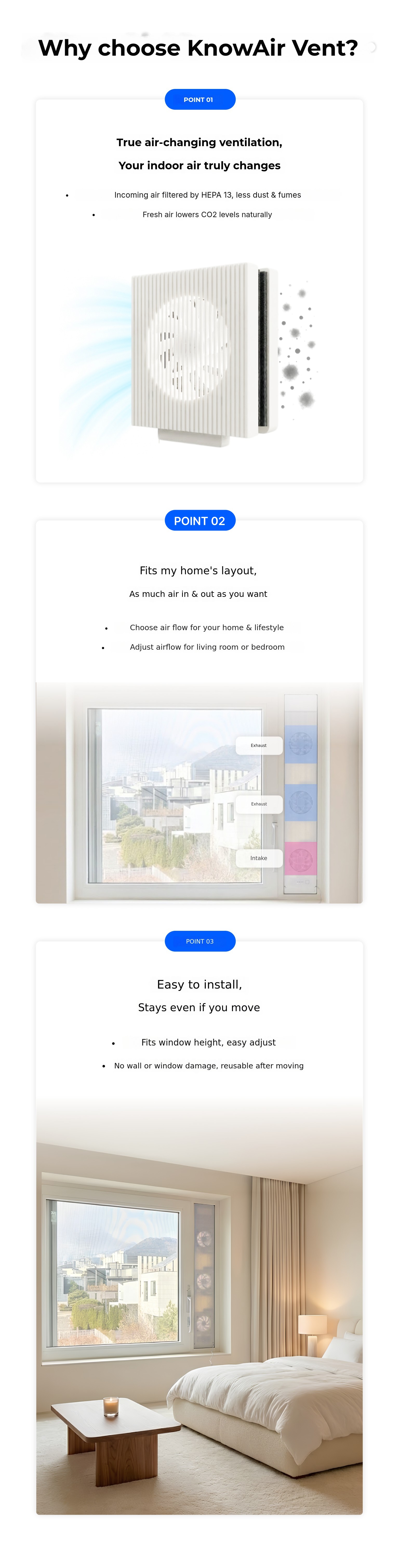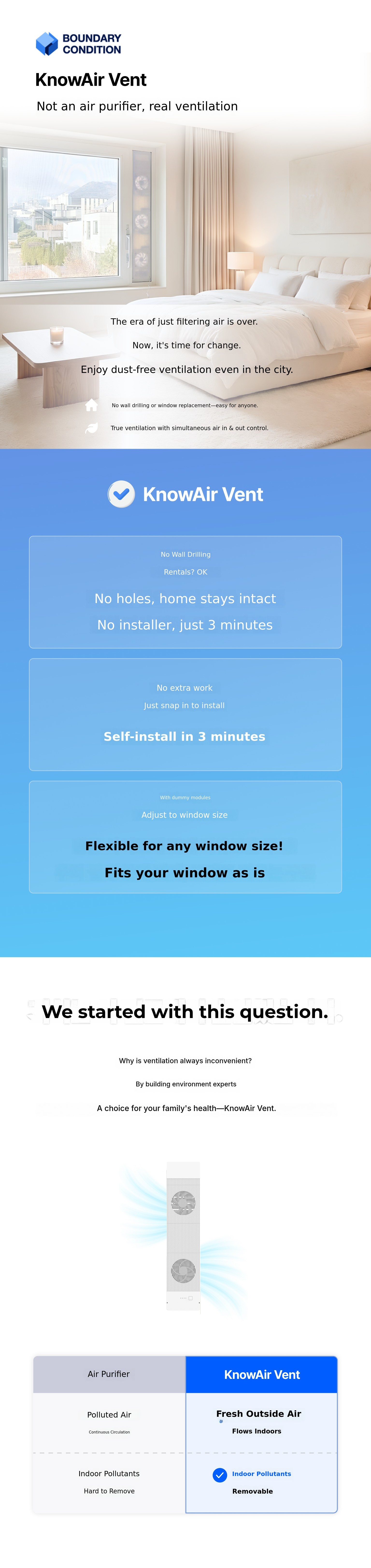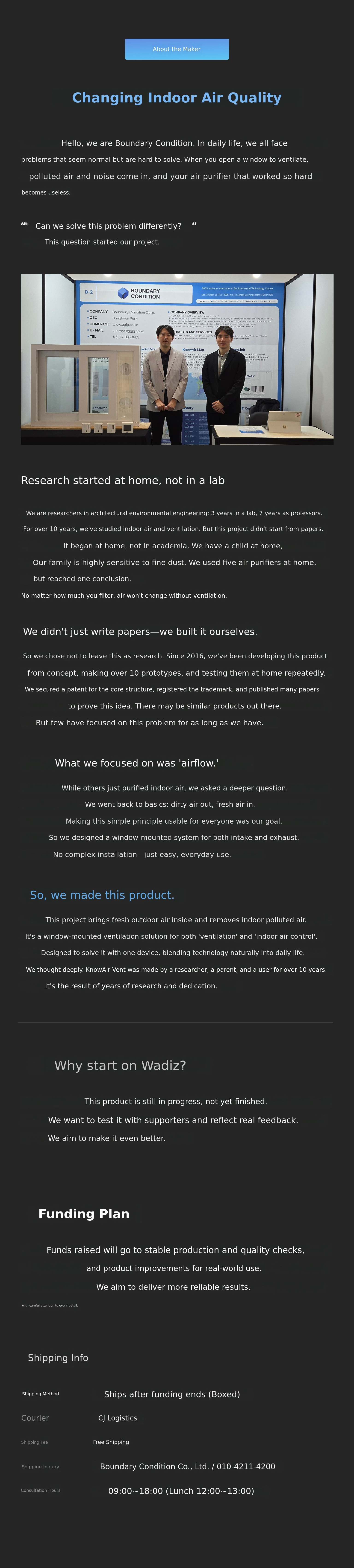 1. 🌬️ Window-mounted ventilation device - Enables simultaneous intake and exhaust ventilation by simple window installation 2. 🔬 Developed by Seoul National University and LG experts - Reliable ventilation solution based on 10 years of research and patents 3. 🎁 Exclusive WADIZ funding offer - Special discounts and limited packages available only on WADIZ