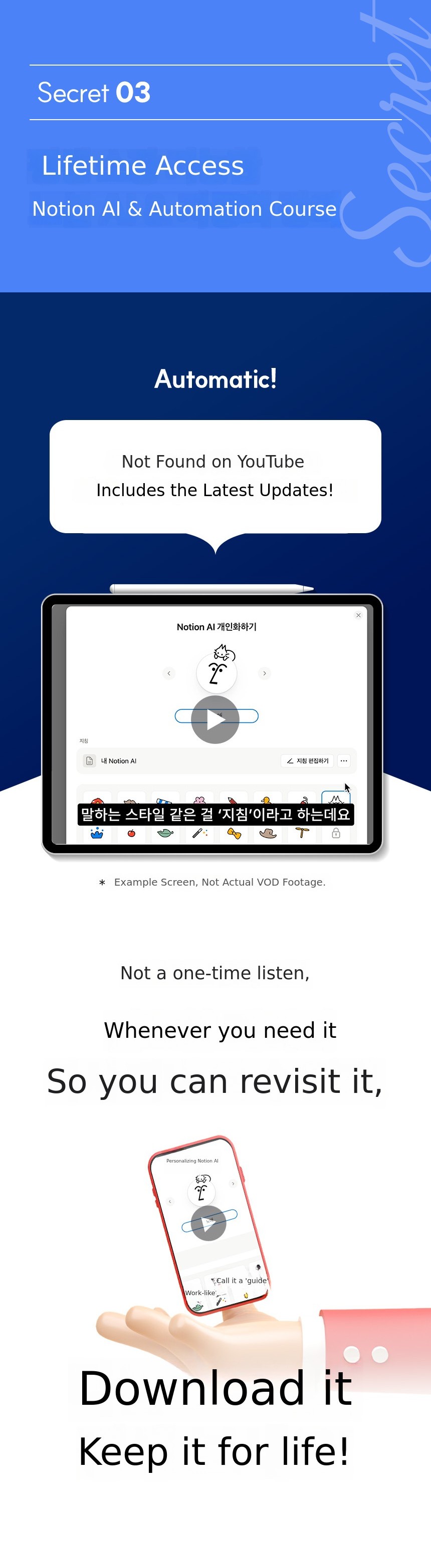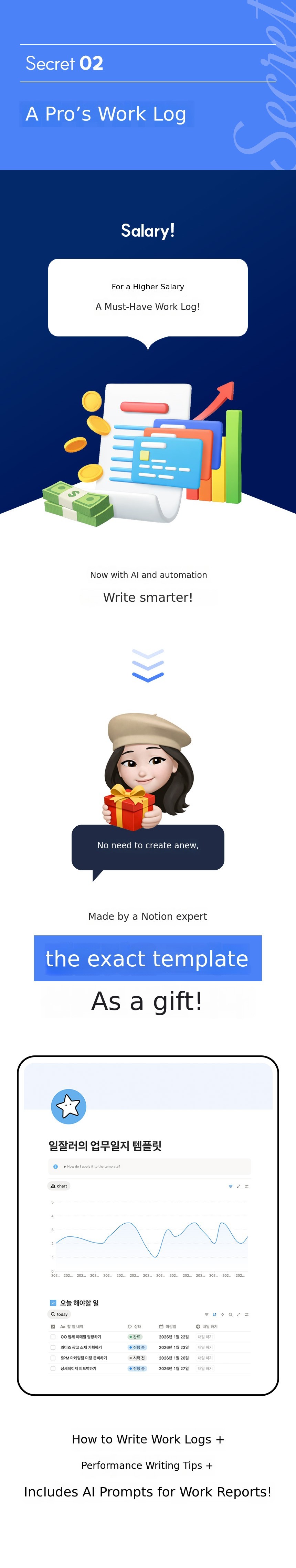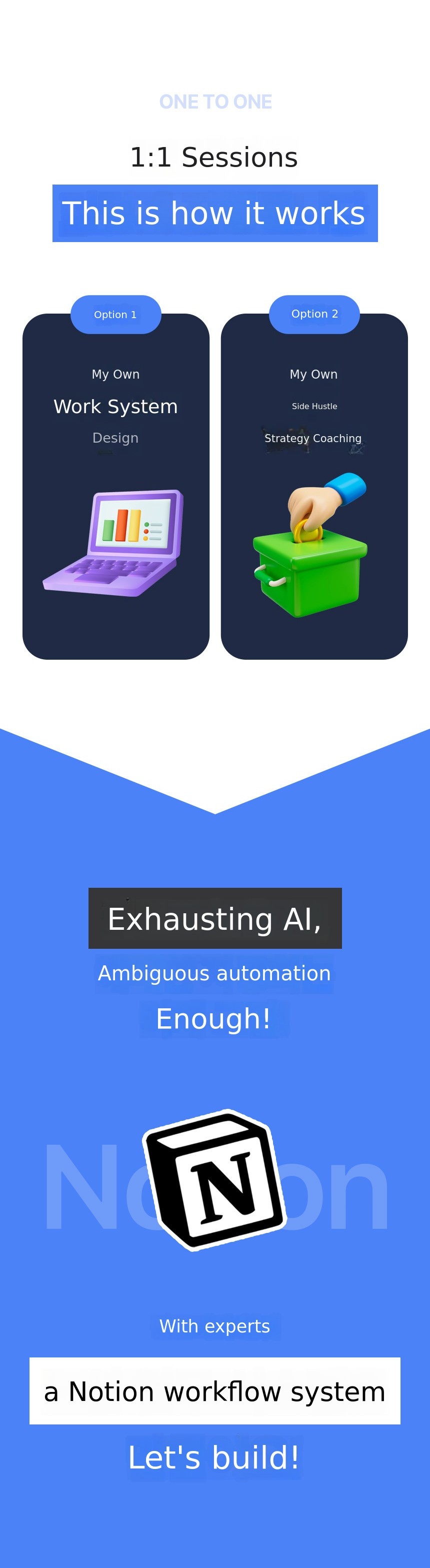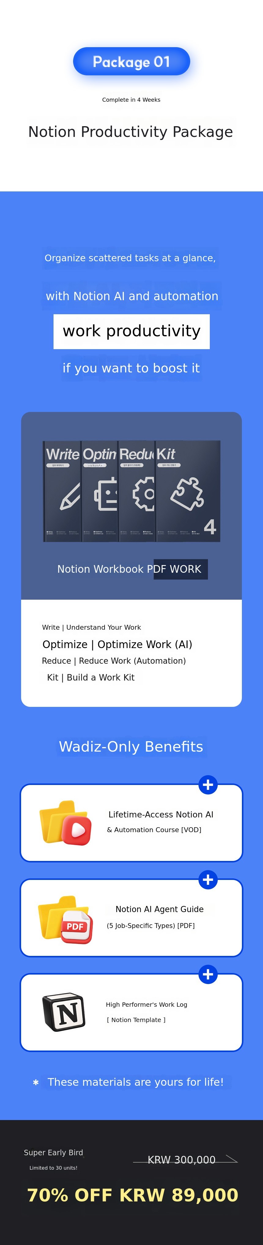 1. π Notion AI Learning Sheet - Save 5 hours weekly with 30 minutes daily learning 2. π€ AI Automation Solution - Automate repetitive tasks to maximize work efficiency 3. π― Customized Work System - Personalized Notion system with 1:1 coaching support
