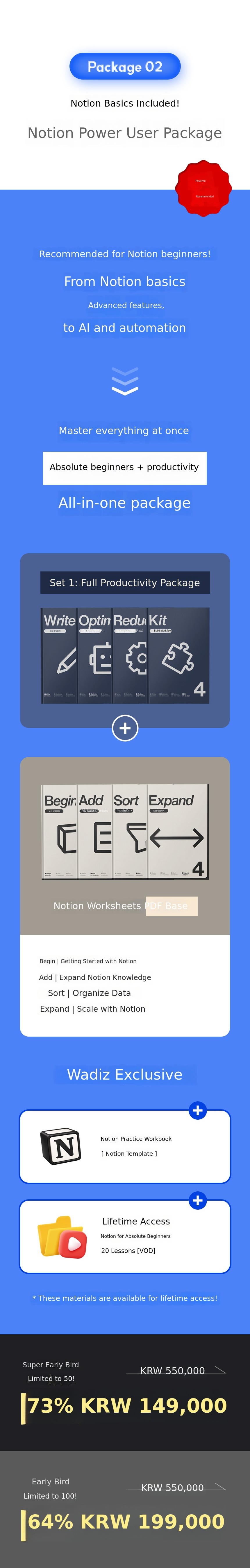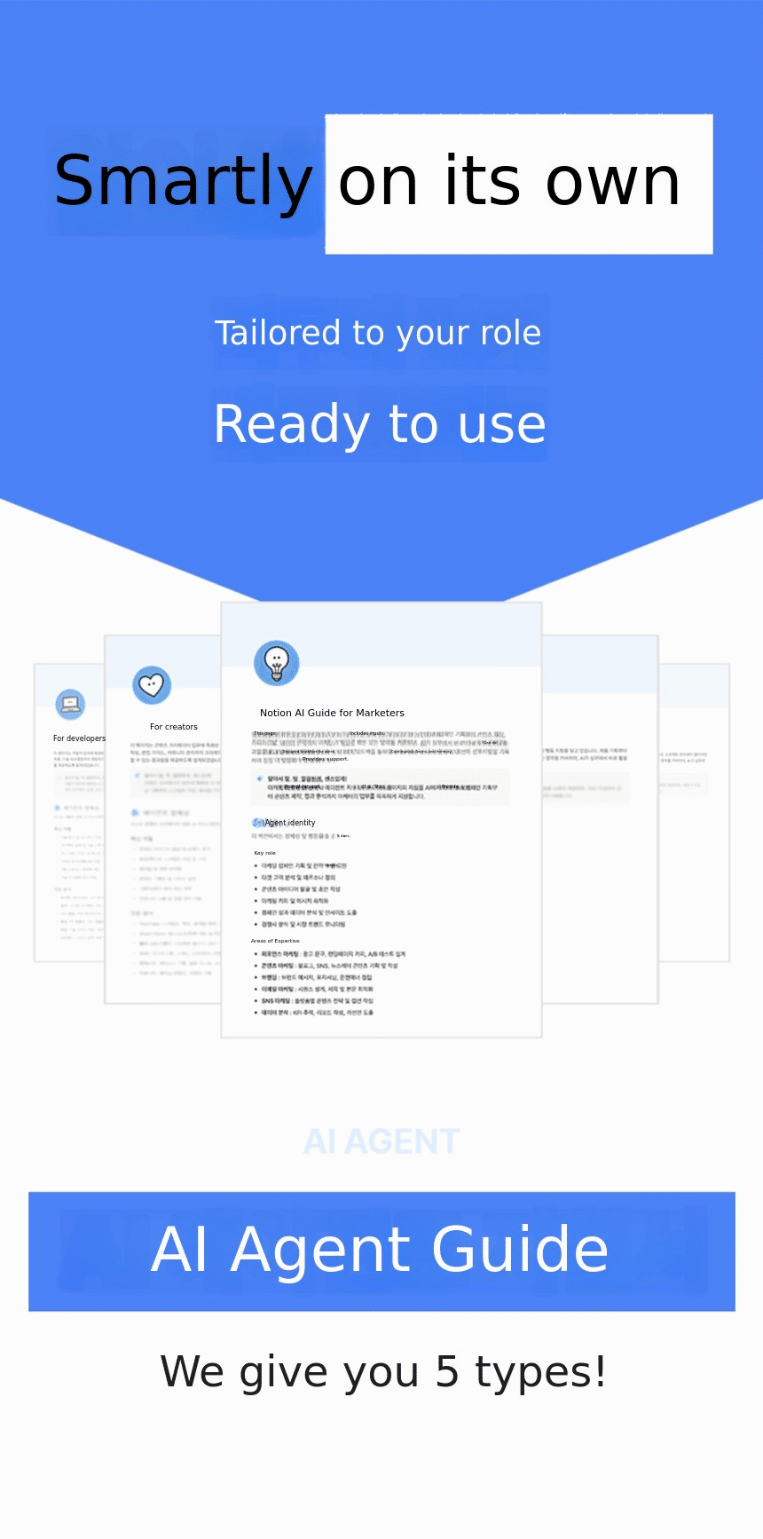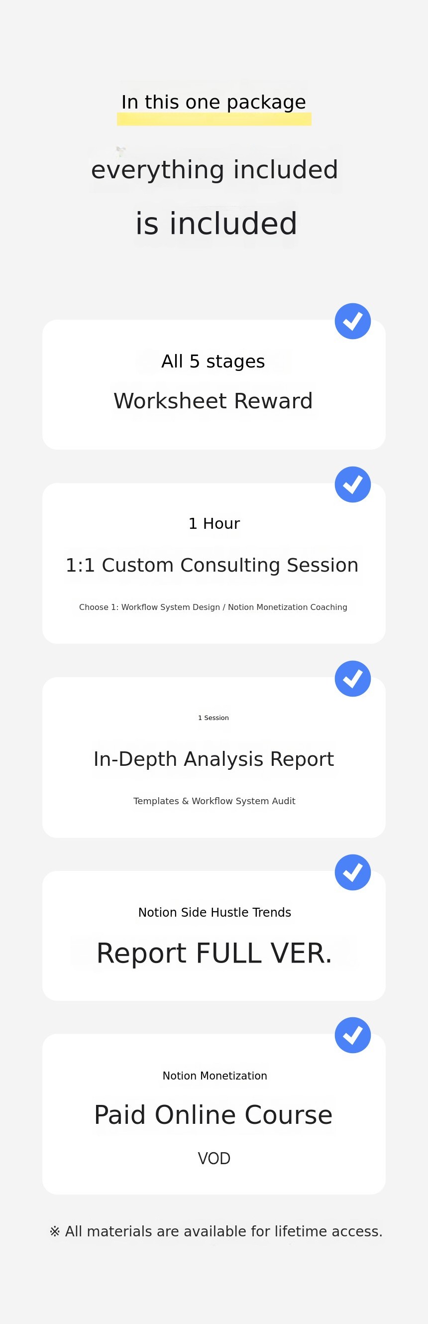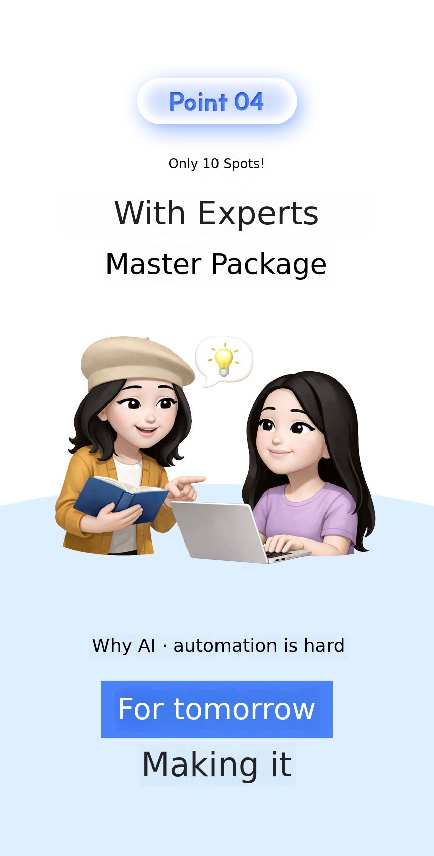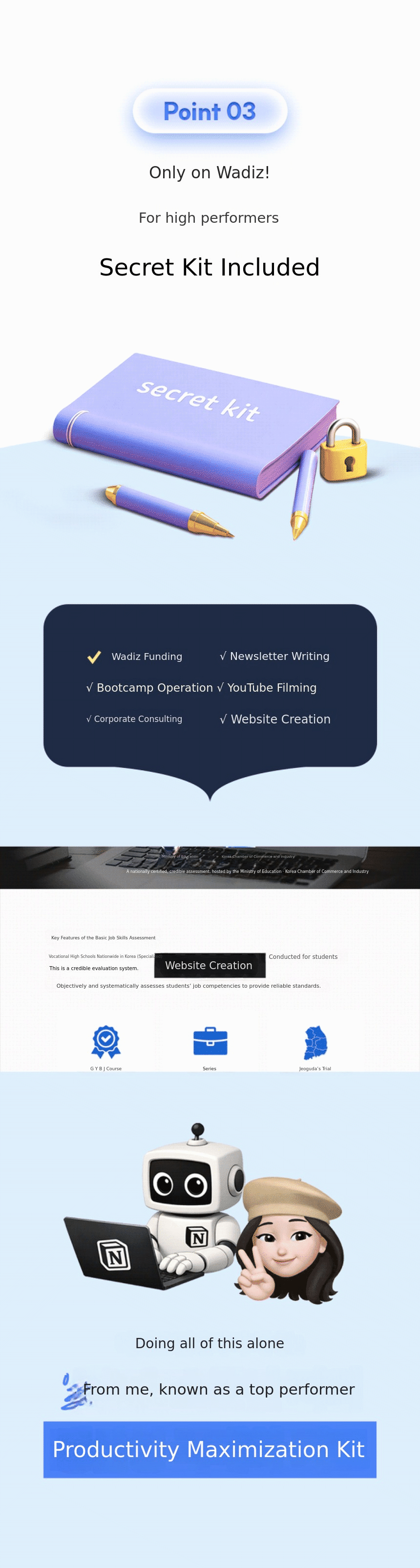 1. π Notion AI Learning Sheet - Save 5 hours weekly with 30 minutes daily learning 2. π€ AI Automation Solution - Automate repetitive tasks to maximize work efficiency 3. π― Customized Work System - Personalized Notion system with 1:1 coaching support