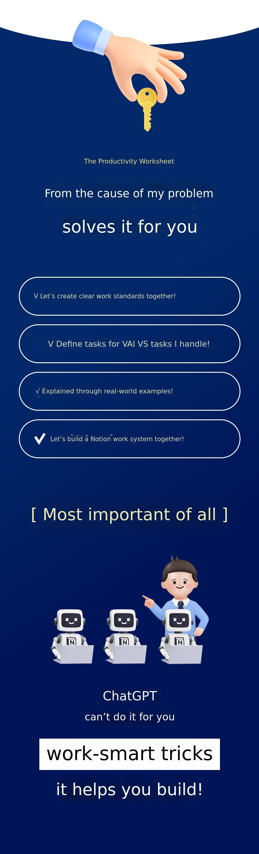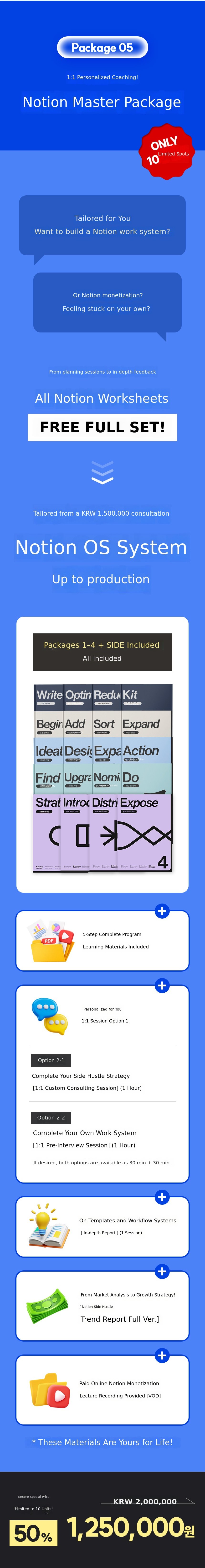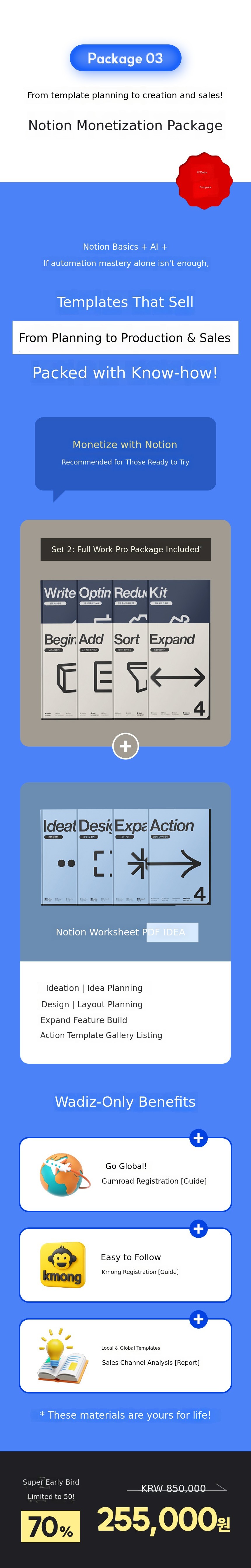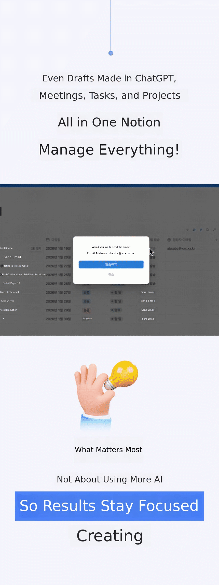 1. π Notion AI Learning Sheet - Save 5 hours weekly with 30 minutes daily learning 2. π€ AI Automation Solution - Automate repetitive tasks to maximize work efficiency 3. π― Customized Work System - Personalized Notion system with 1:1 coaching support