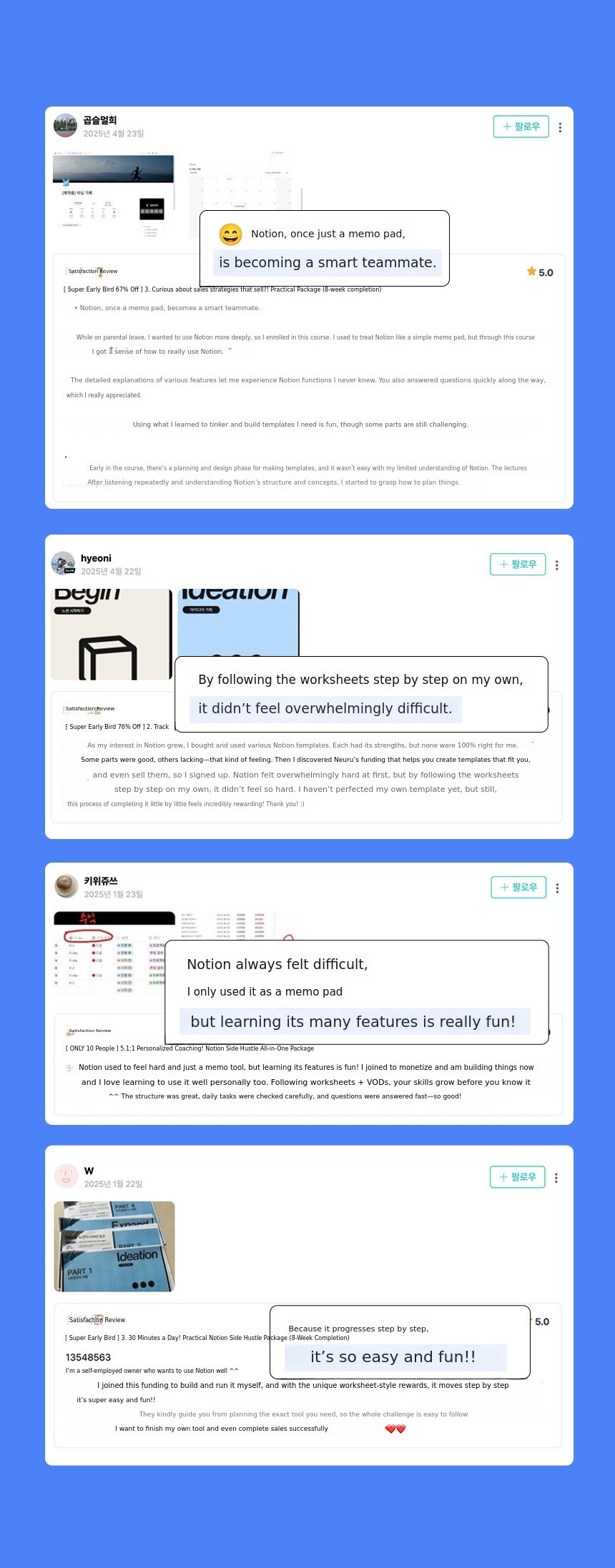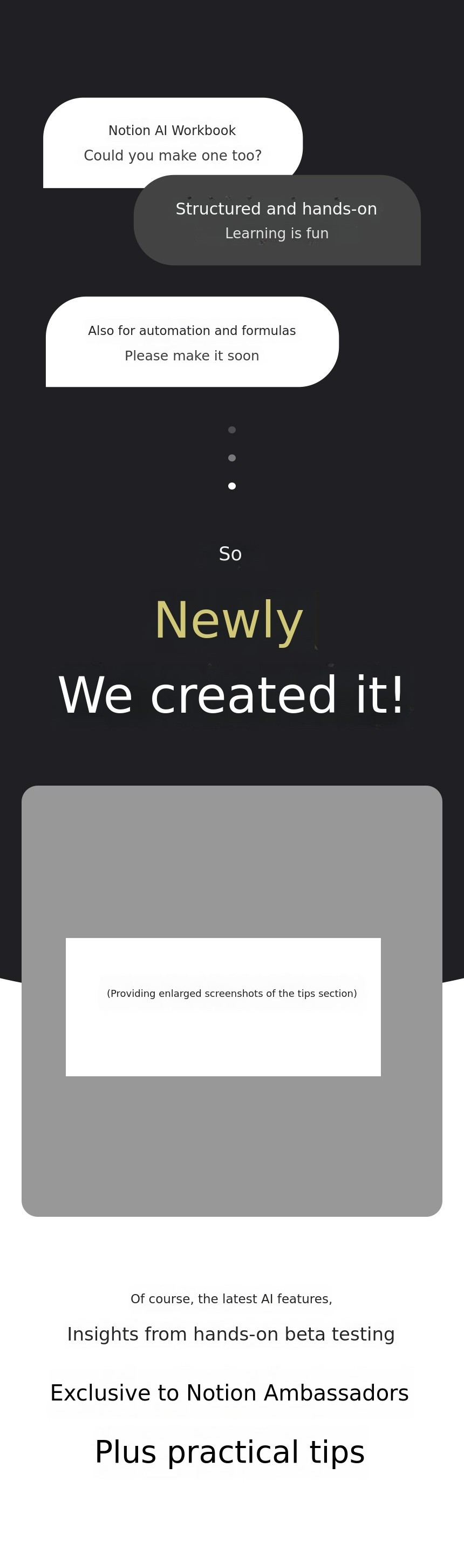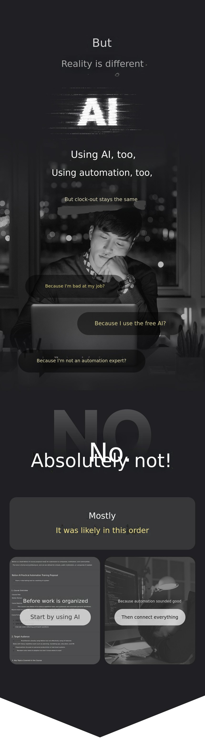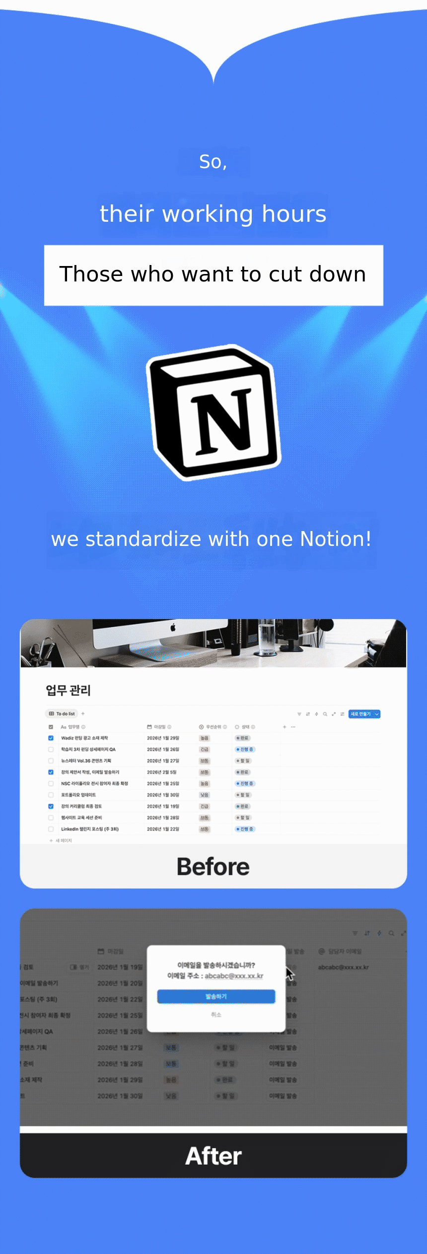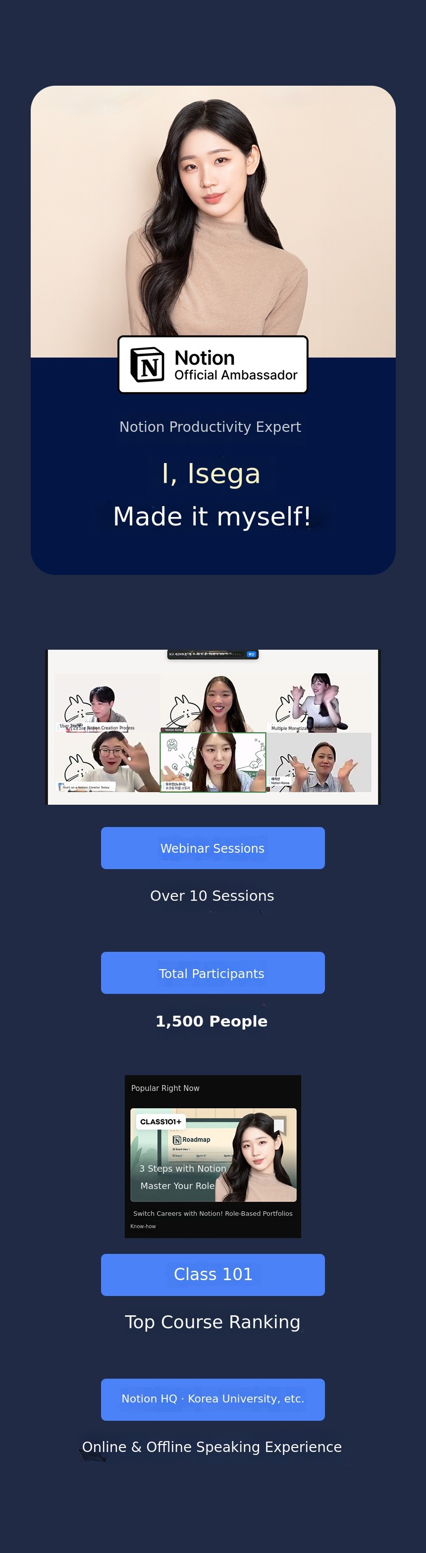 1. π Notion AI Learning Sheet - Save 5 hours weekly with 30 minutes daily learning 2. π€ AI Automation Solution - Automate repetitive tasks to maximize work efficiency 3. π― Customized Work System - Personalized Notion system with 1:1 coaching support