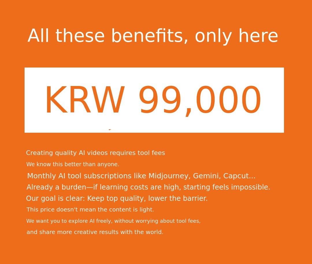 "99,000 won" reward price: Just because the price is lower than other rewards does not mean the quality is inferior. There is only one reason we set the price of this lecture at 99,000 won, which is cheaper than others. It is because we want many people to show what a truly beneficial lecture is, not an expensive one with no substance. That is our purpose.