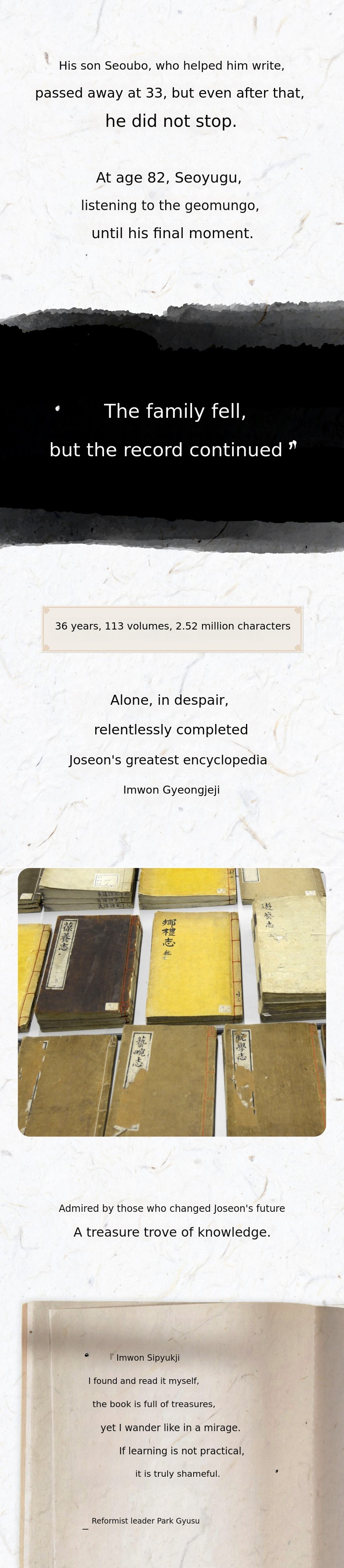 Although the initial translation process alone cost a total of 1 billion KRW due to the vast volume of ancient documents, this project began with the desperate belief that 'if not now, it will be lost forever.'