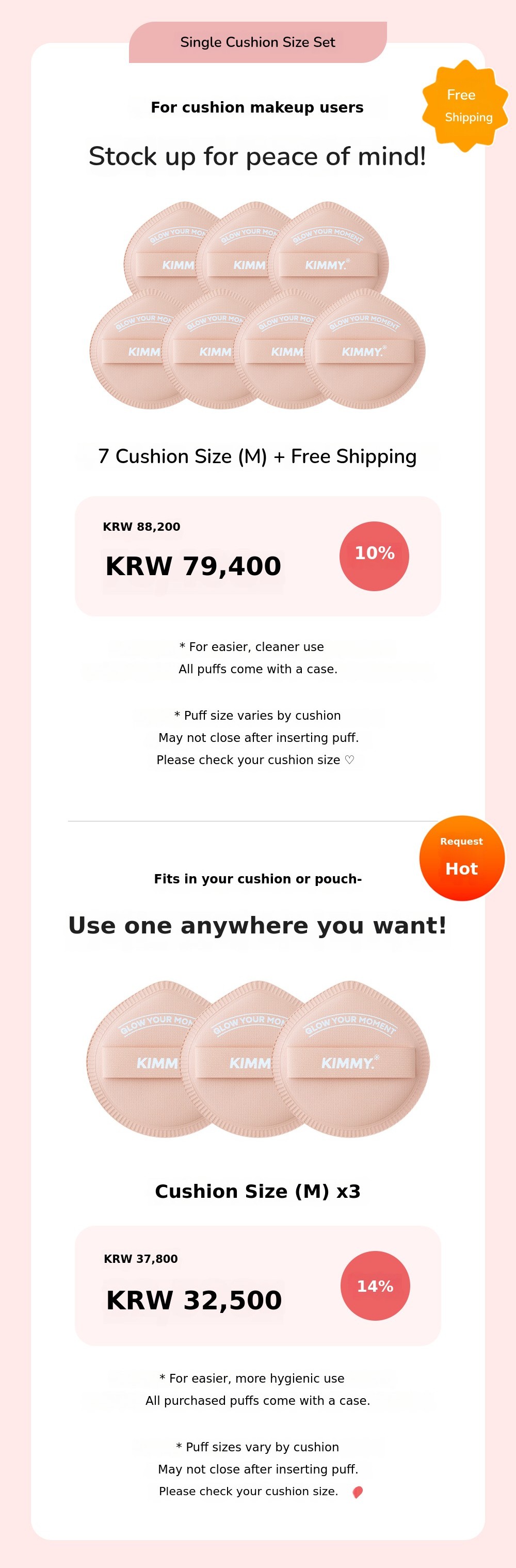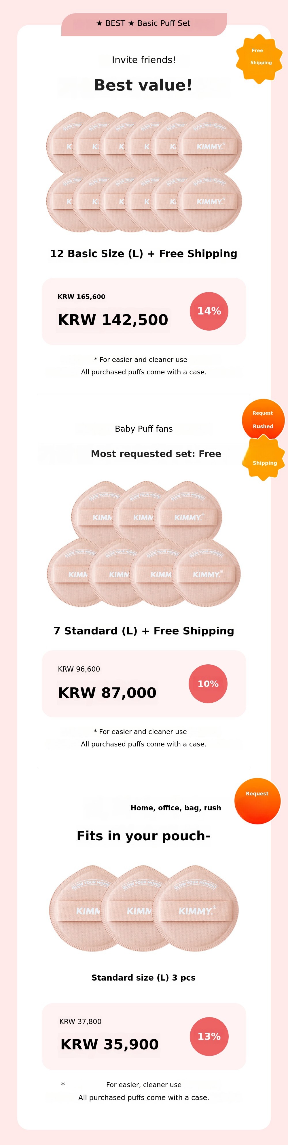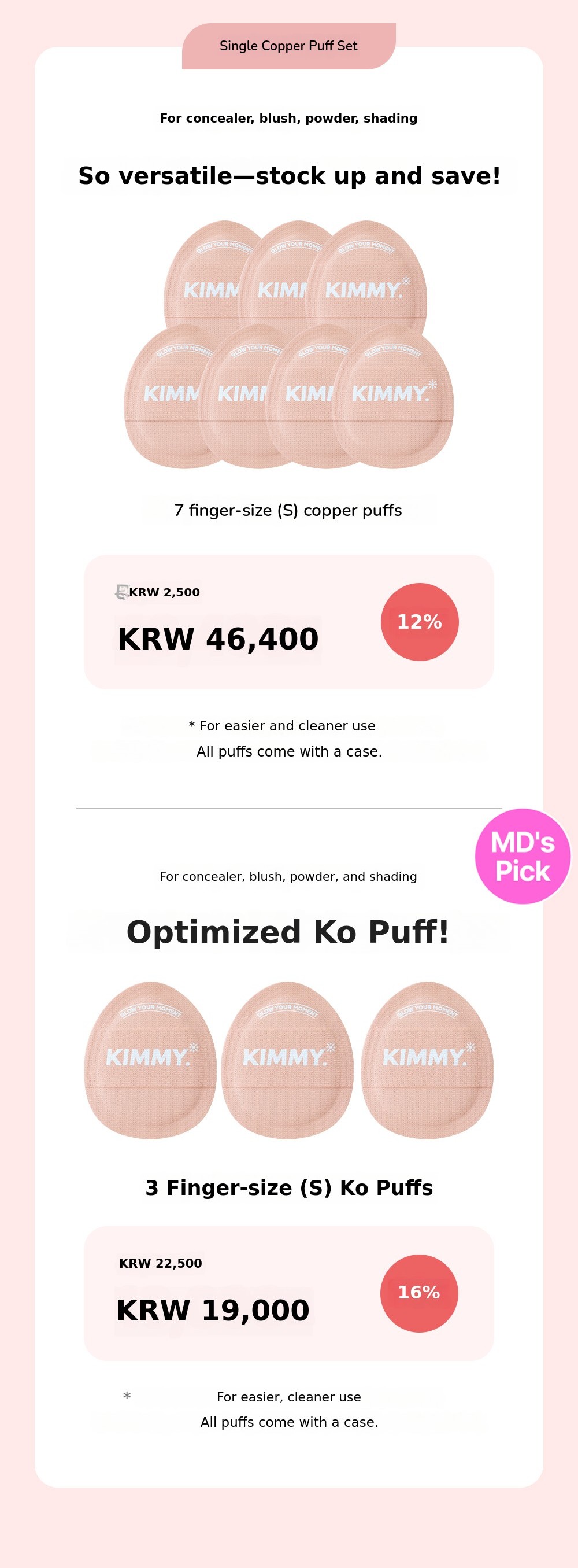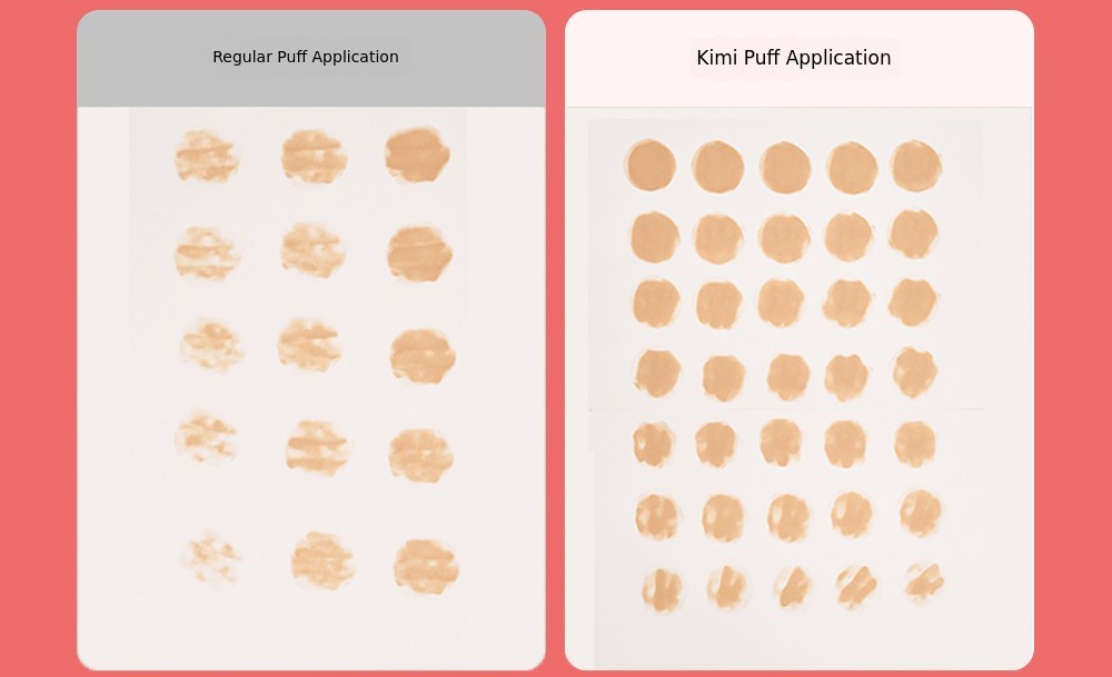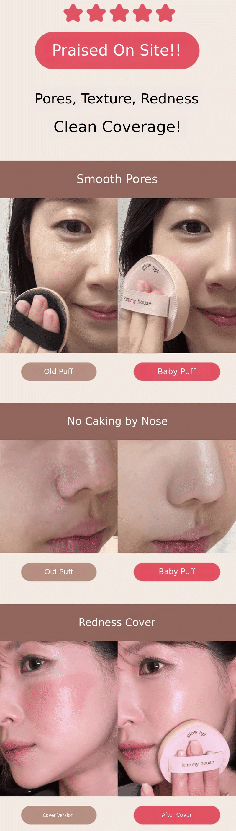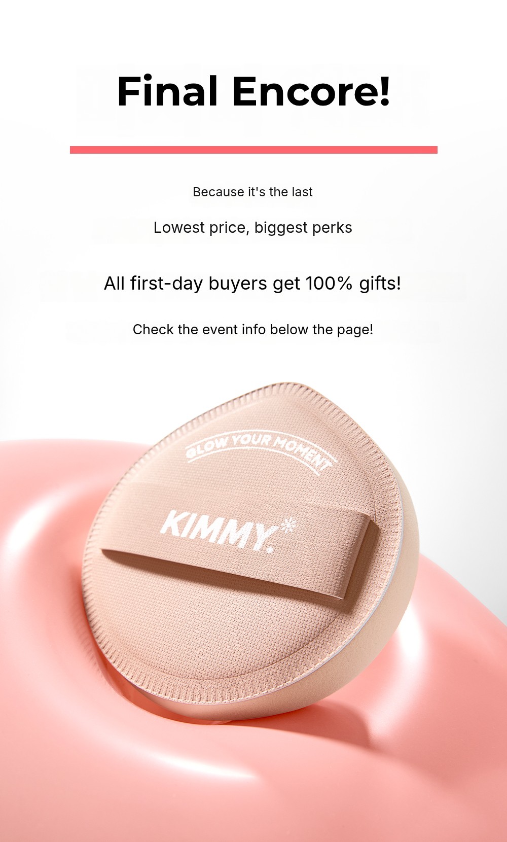 Even after applying cushions and foundations famous for their moisture, I couldn't achieve that wow-worthy radiance. What was the problem? After some research, I found the answer in the "puff." No matter how moist the cushion is, the puff absorbs all the moisture! I spent over a year researching and cutting open hundreds of puffs to find one that would truly deliver moisture to the skin! It was very difficult to find a manufacturer, but I didn't give up, thinking of supporters who have the same concerns as I do! Show off both the vitality and dewy radiance of your skin with KIMMY's Baby Bottom Puff. KIMMY will help you!