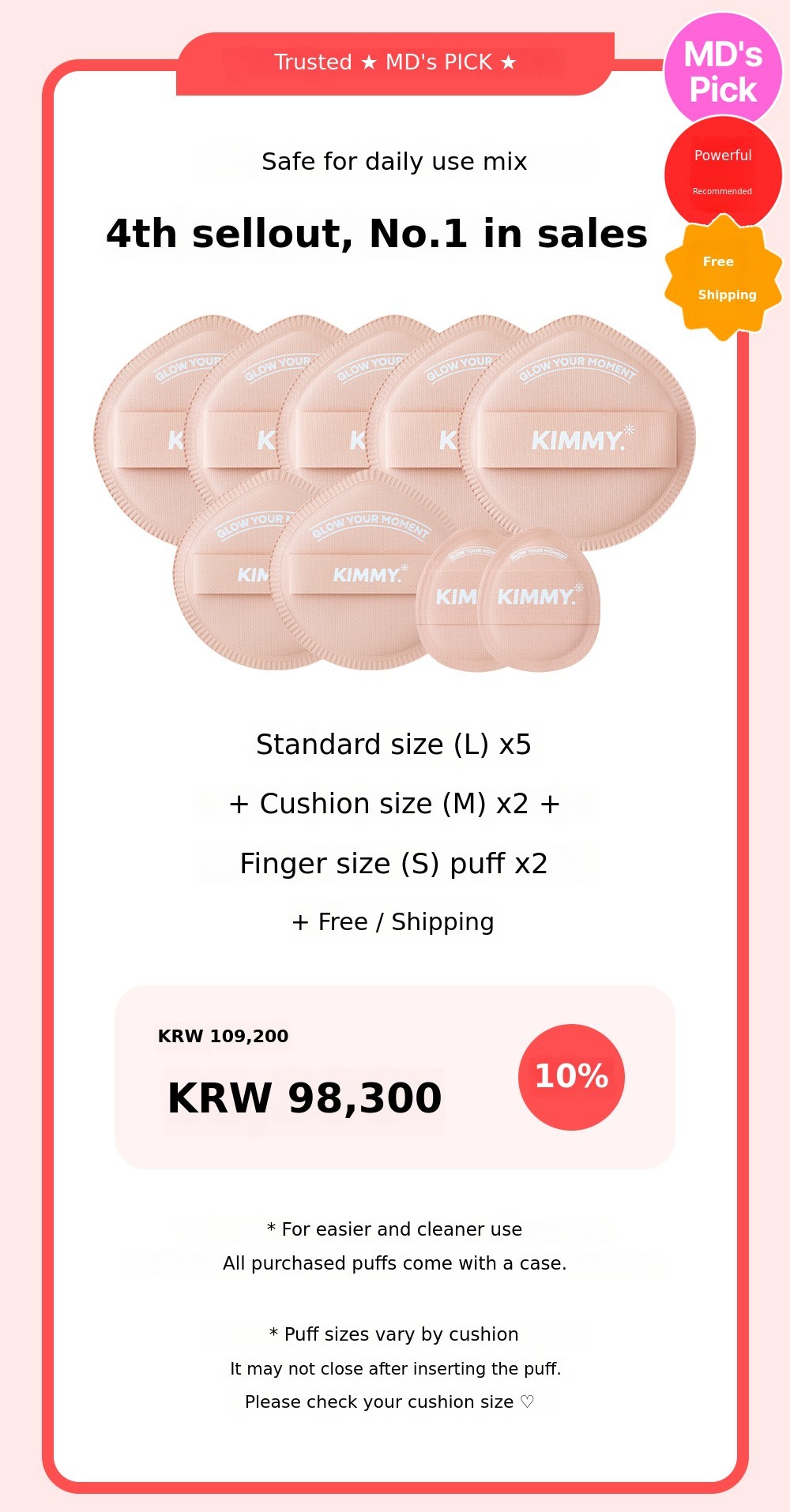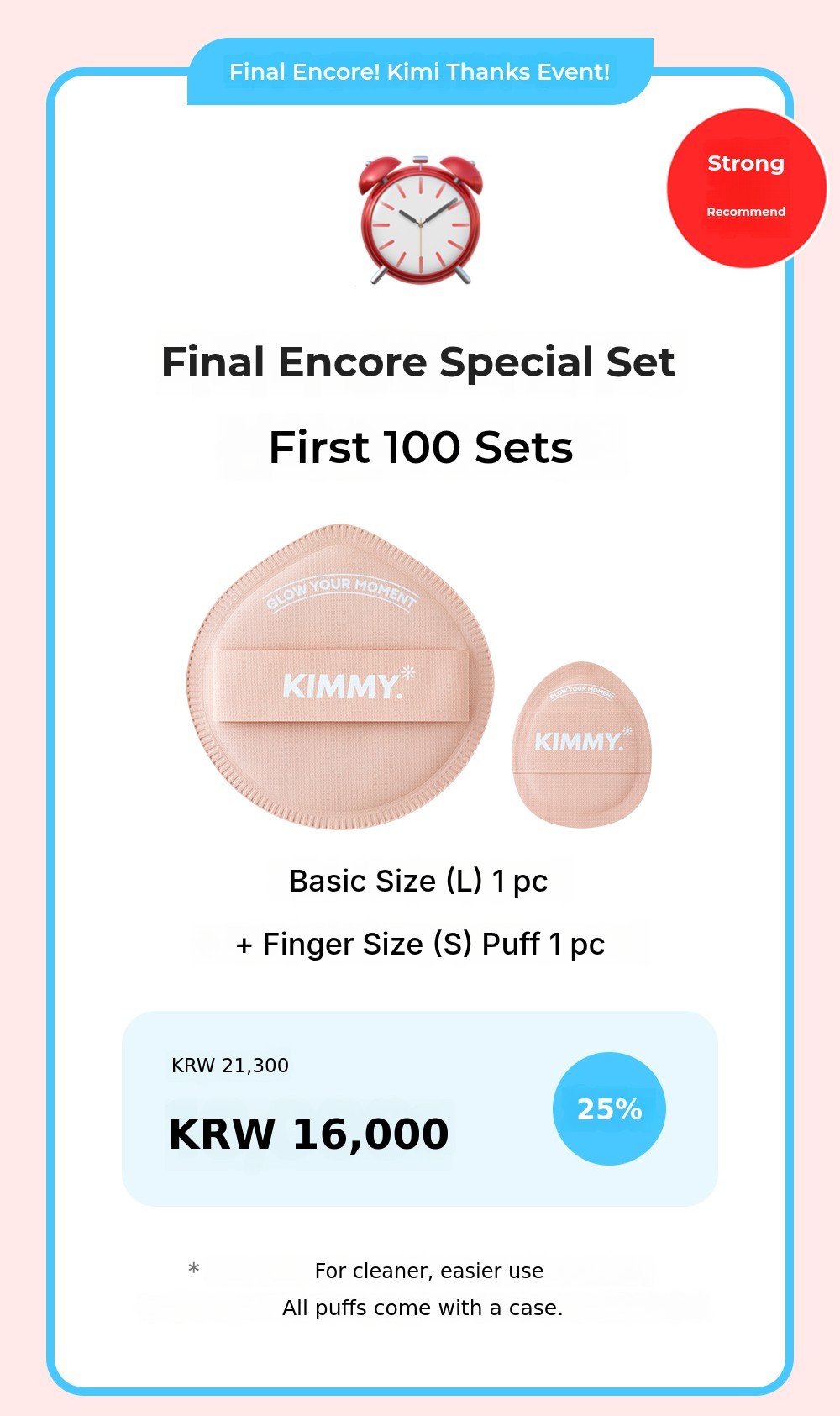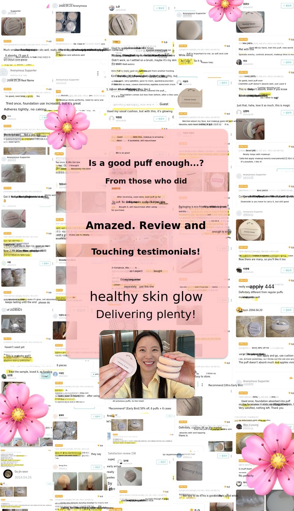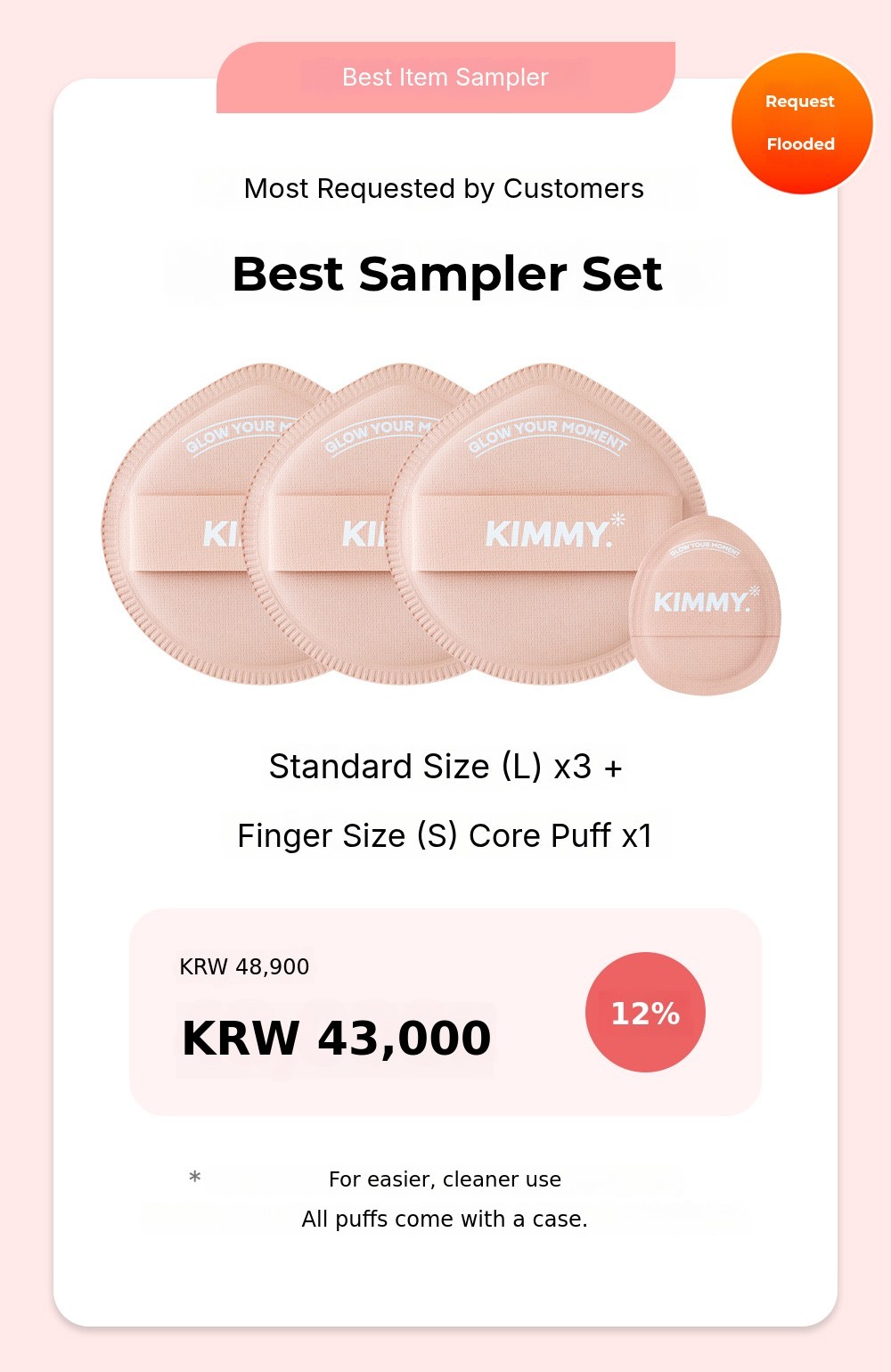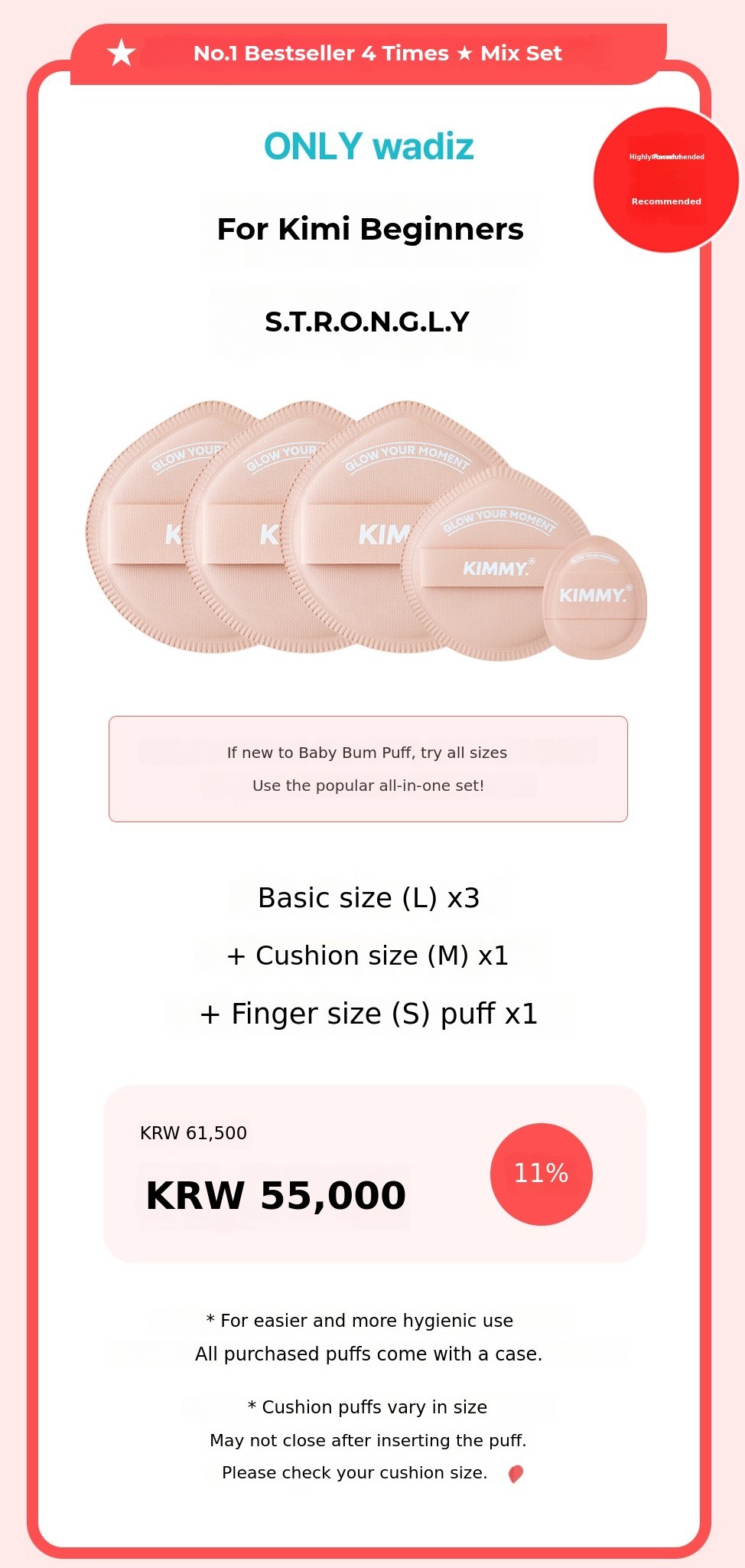 Even after applying cushions and foundations famous for their moisture, I couldn't achieve that wow-worthy radiance. What was the problem? After some research, I found the answer in the "puff." No matter how moist the cushion is, the puff absorbs all the moisture! I spent over a year researching and cutting open hundreds of puffs to find one that would truly deliver moisture to the skin! It was very difficult to find a manufacturer, but I didn't give up, thinking of supporters who have the same concerns as I do! Show off both the vitality and dewy radiance of your skin with KIMMY's Baby Bottom Puff. KIMMY will help you!