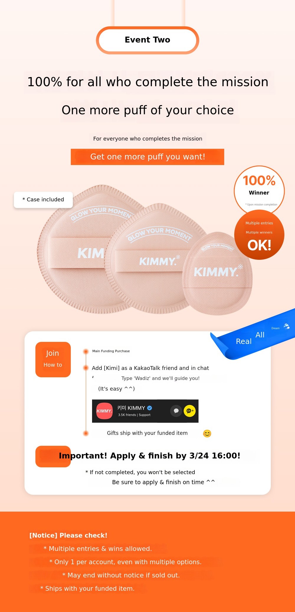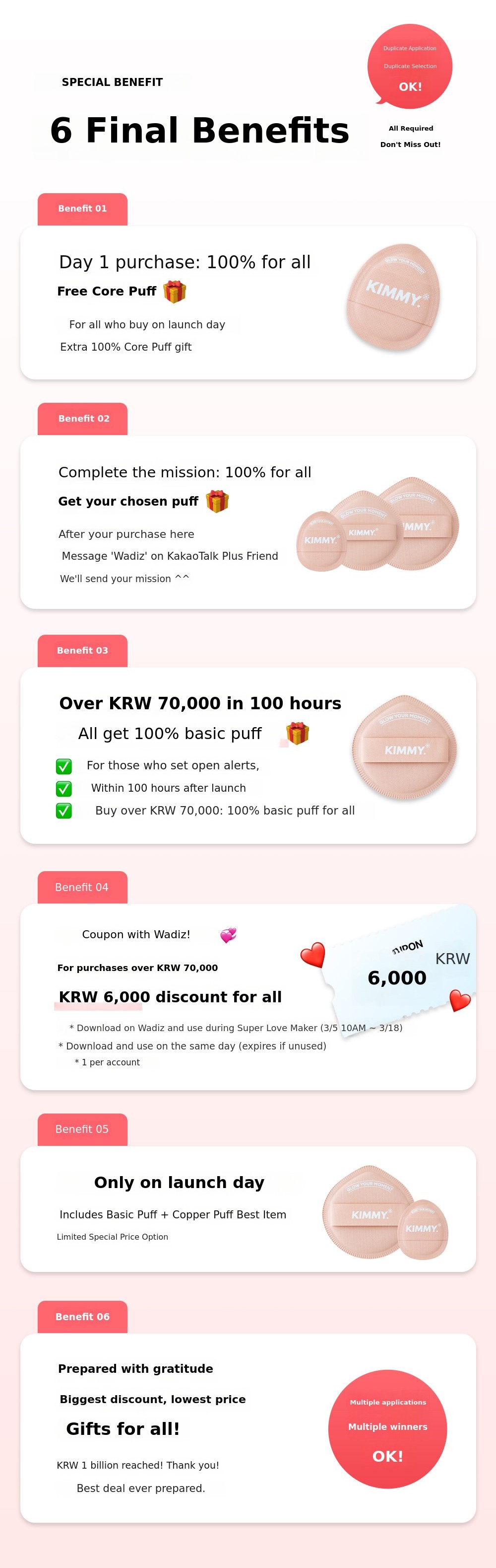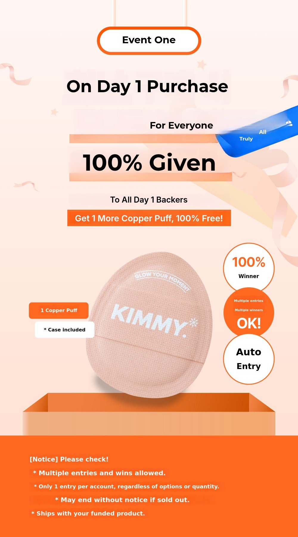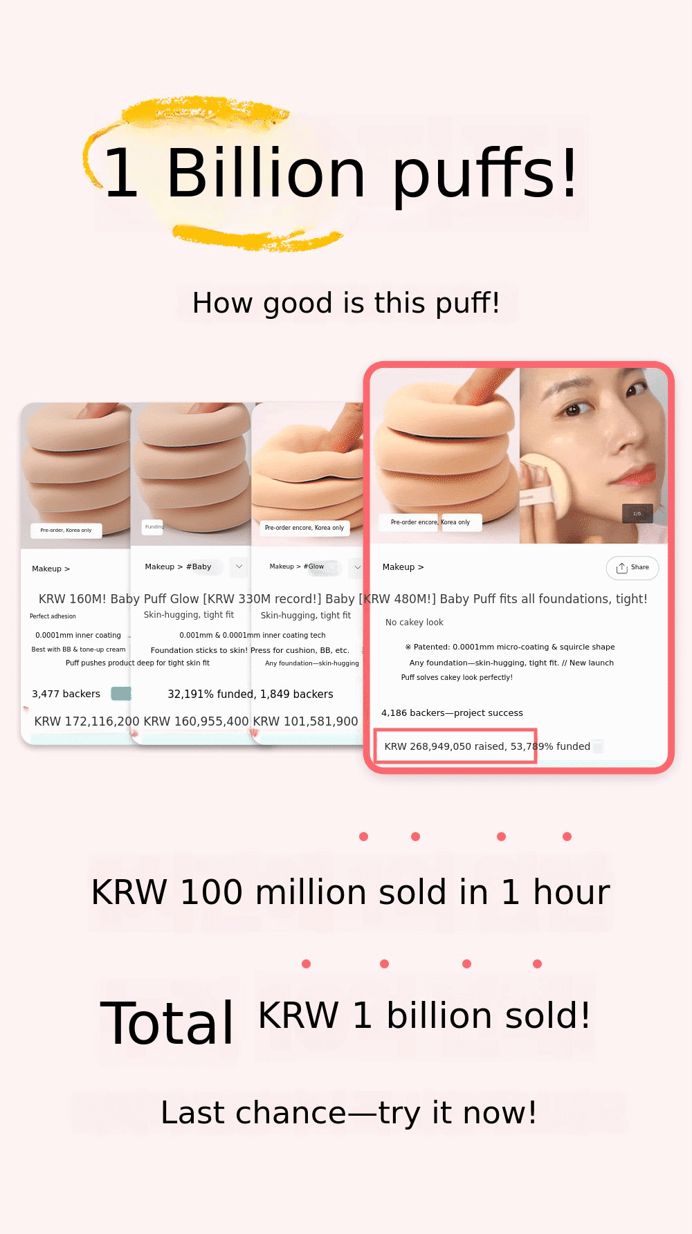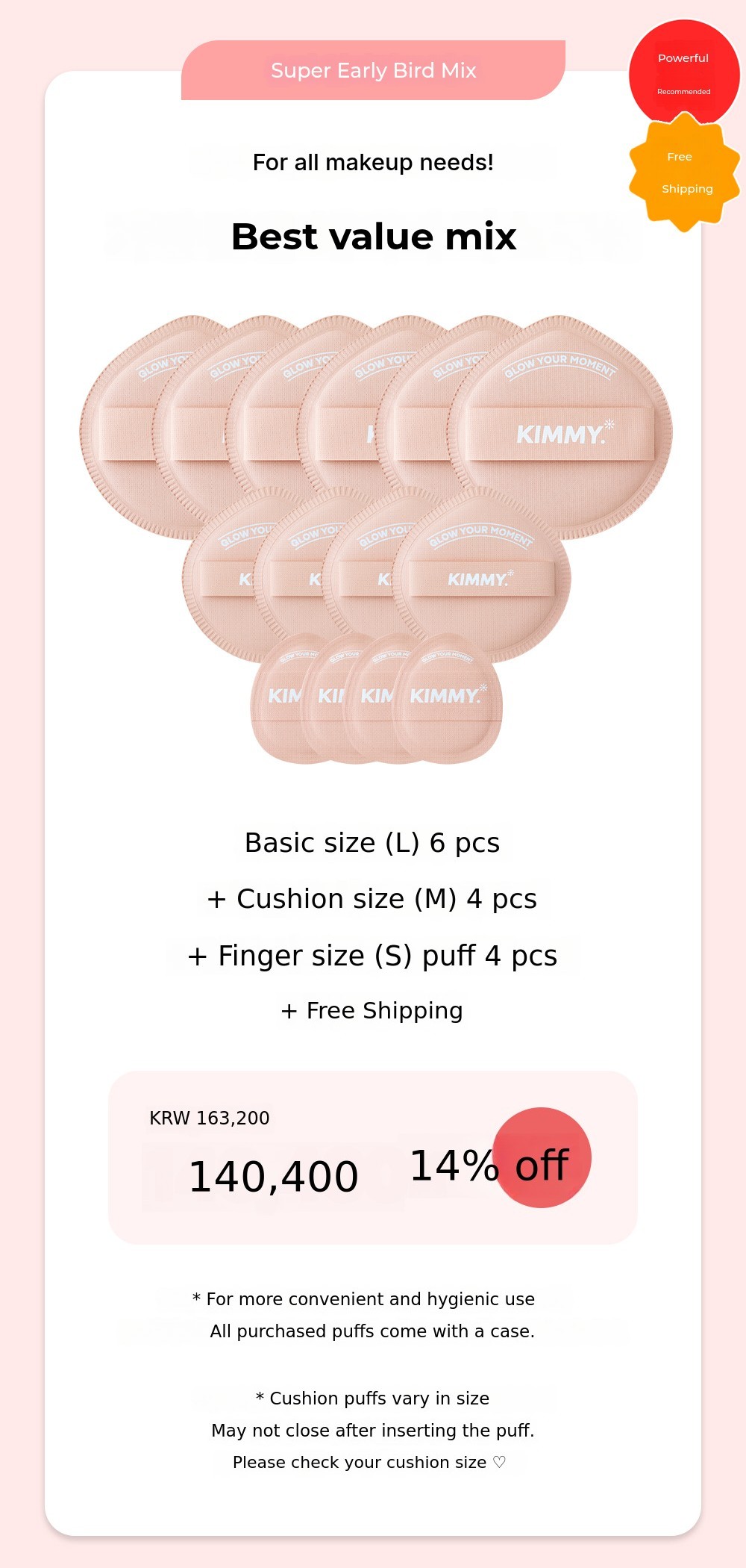 Even after applying cushions and foundations famous for their moisture, I couldn't achieve that wow-worthy radiance. What was the problem? After some research, I found the answer in the "puff." No matter how moist the cushion is, the puff absorbs all the moisture! I spent over a year researching and cutting open hundreds of puffs to find one that would truly deliver moisture to the skin! It was very difficult to find a manufacturer, but I didn't give up, thinking of supporters who have the same concerns as I do! Show off both the vitality and dewy radiance of your skin with KIMMY's Baby Bottom Puff. KIMMY will help you!