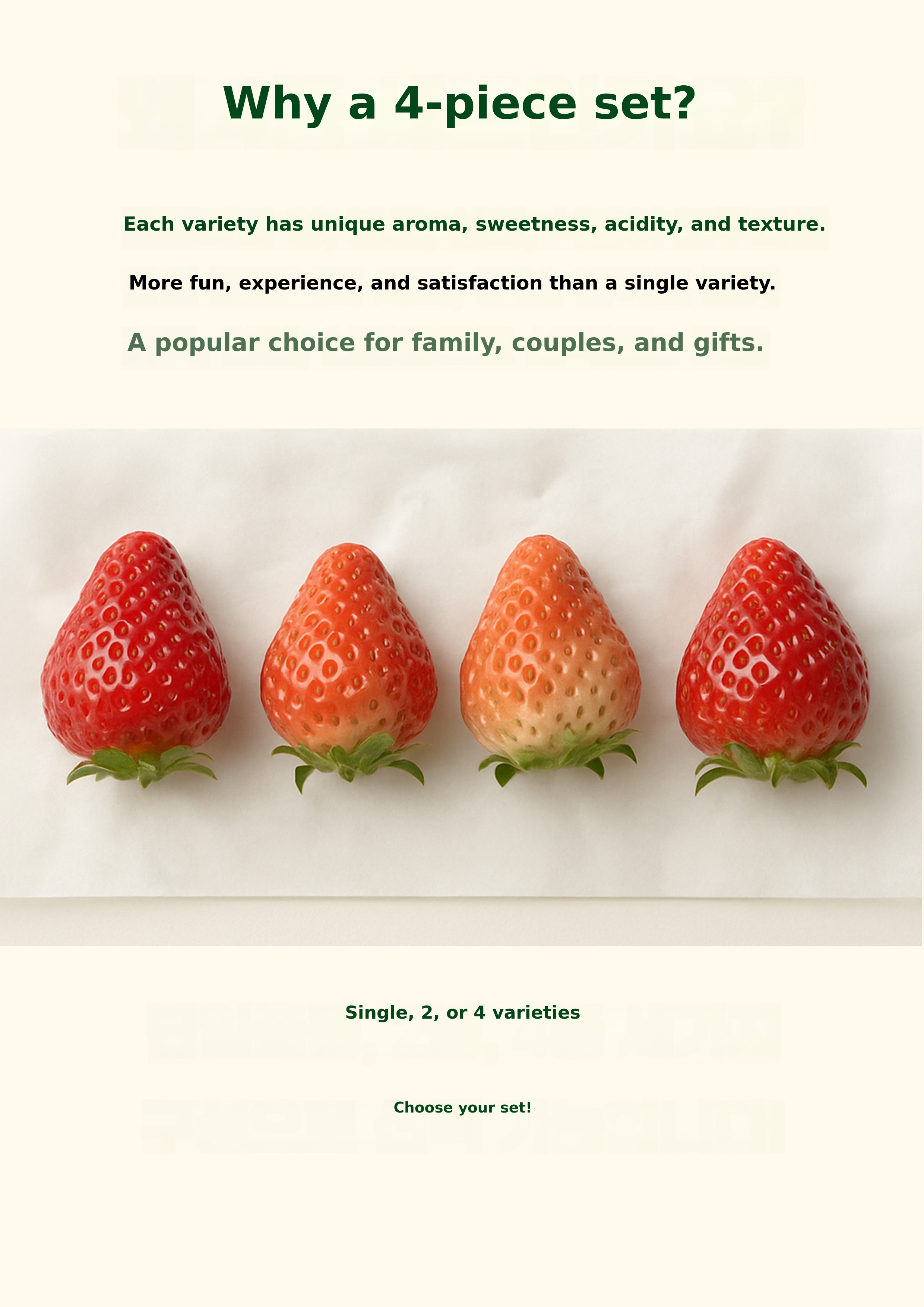 We have prepared a selection where you can freely choose and pack from a total of four strawberry varieties.