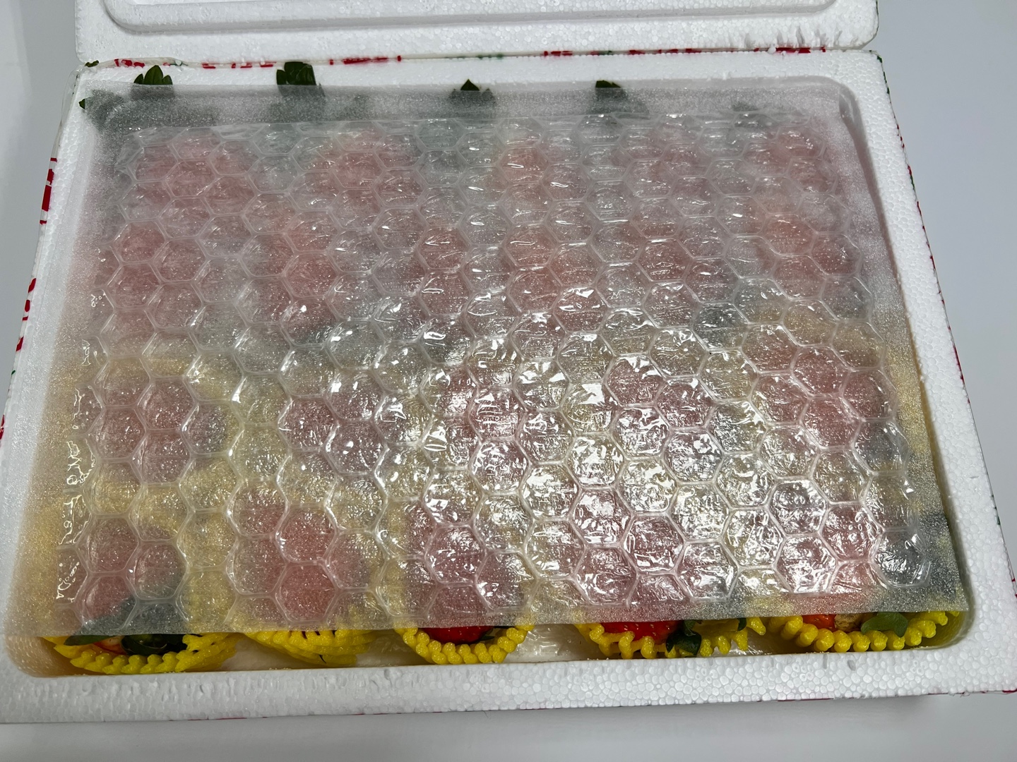 Each piece is carefully wrapped with a protective net and then packed in a sturdy strawberry-exclusive