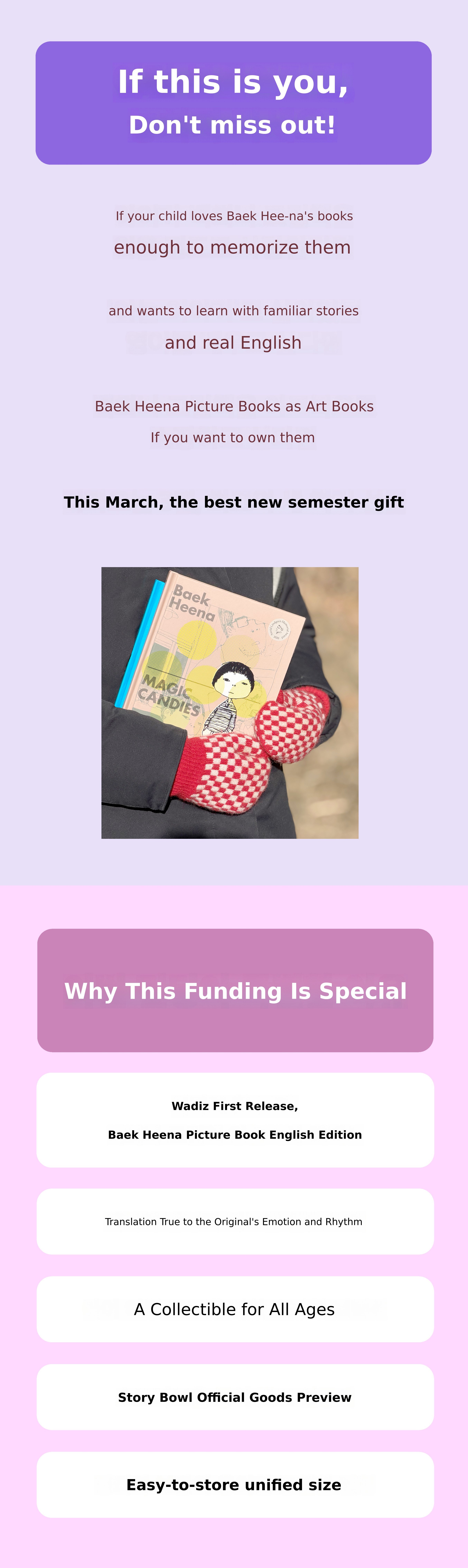 We did not want this to be just a book translated into English. We hoped that the moment you experience the story's emotion in English, it would become another literary experience. Sentences that flow naturally when read aloud, a handy format easy for children to carry, a weight that allows you to open it with one hand at your bedside, the charm of an art book that even adults would want to own, and even an 'audio experience' that draws you deeper into the story while easing the burden of reading—we didn't want to miss a single thing. That is why the process was slow. Over time, the translation, design, and composition were revised countless times, and we made many choices without clear answers. Now, we want to complete the final step of delivering Baek Heena's picture books—books you will want to keep close from childhood to adulthood—together with our supporters.