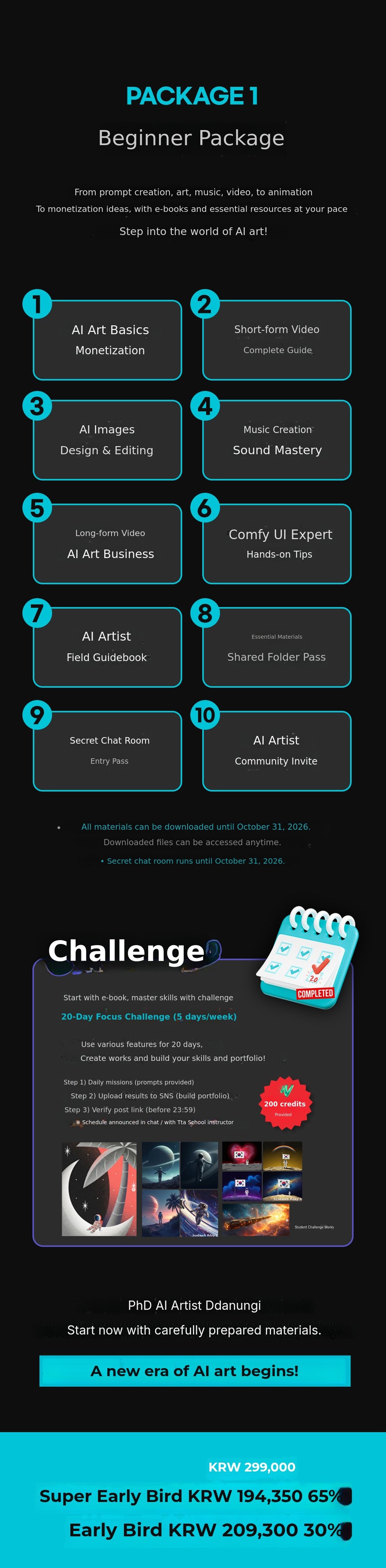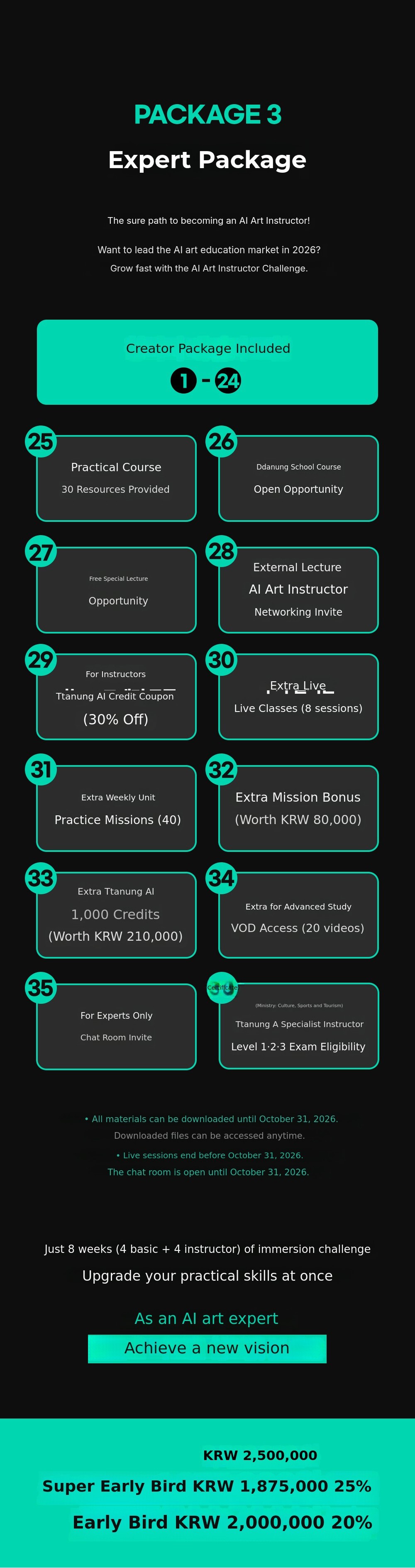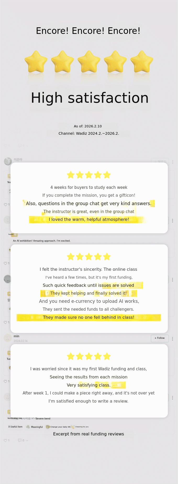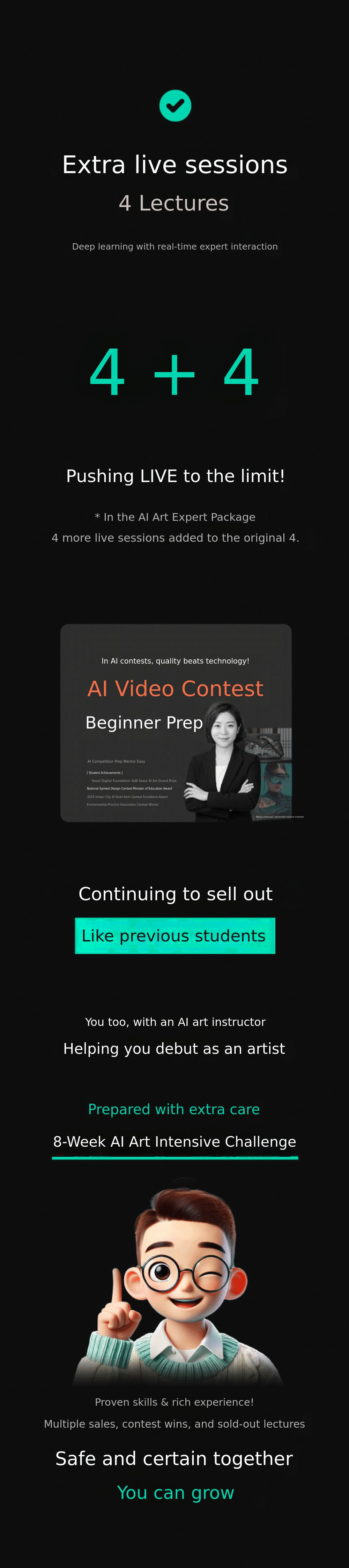 A1. This course is led by Danung, a fourth-year AI artist who has conducted over 100 AI art lectures. The five weekly missions and one live lecture per week are designed to focus only on the core elements, allowing for efficient learning. In fact, many participants who completed the Expert Package are now working as AI art instructors.
