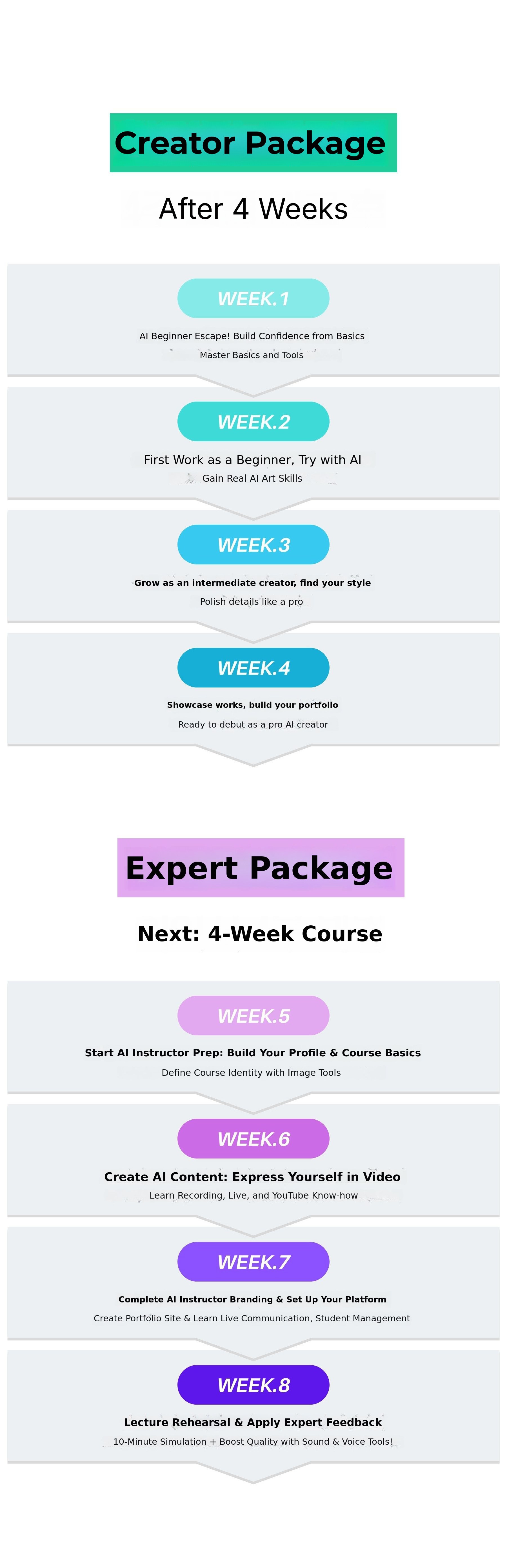 By completing the 4-week or 8-week course, you can debut as an AI artist right away or reach a level where you can immediately apply your skills to future lectures.