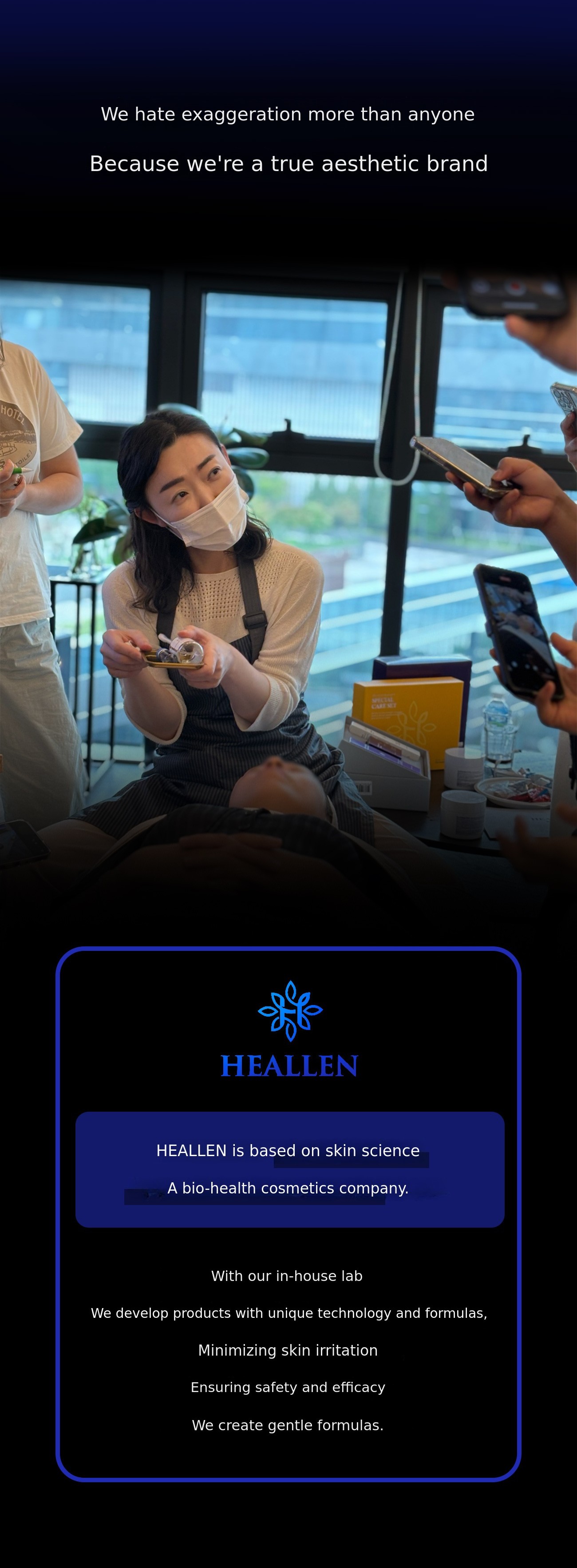 HEALLEN began from the concerns of an expert who has experienced every aspect of cosmetics for 20 years, from sales to education, quality control, and product development.