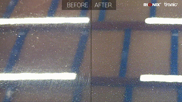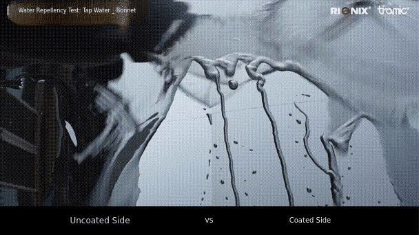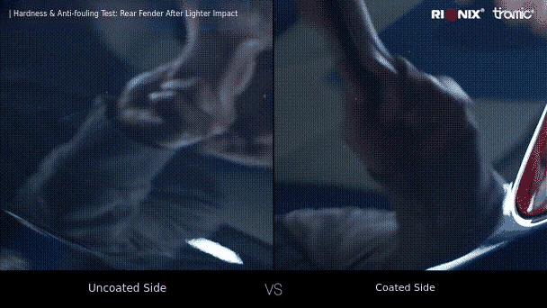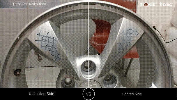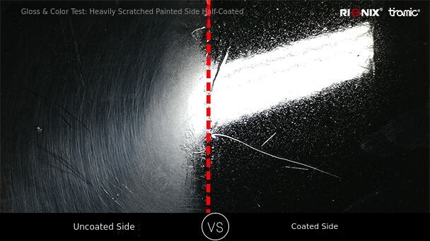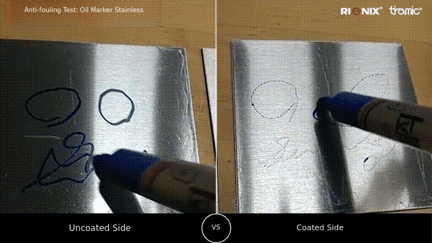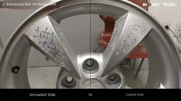 On the left is metal coated with Rionix's technology, on the right is metal without the coating technology applied.