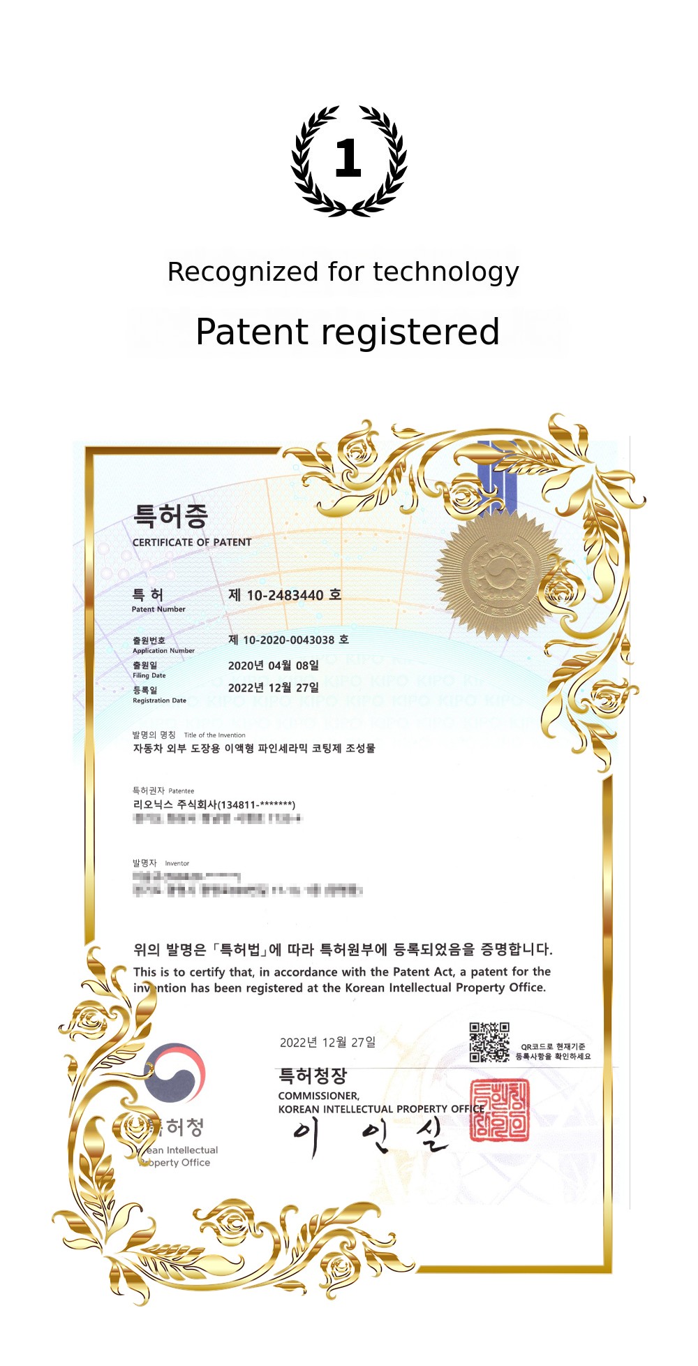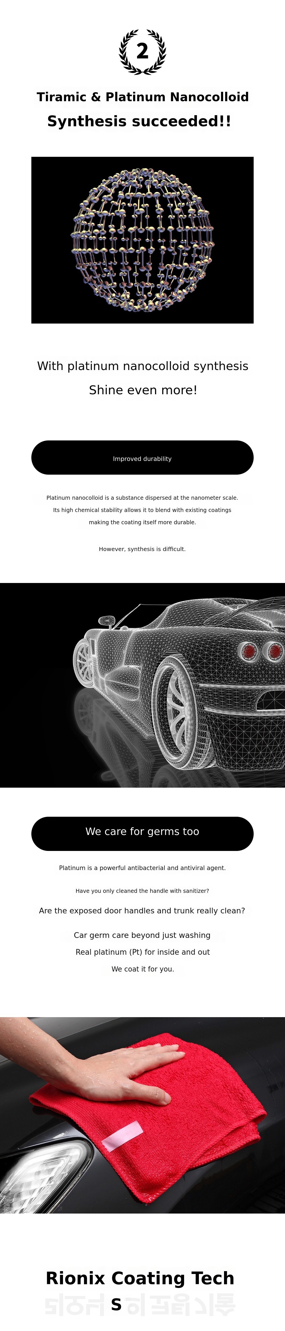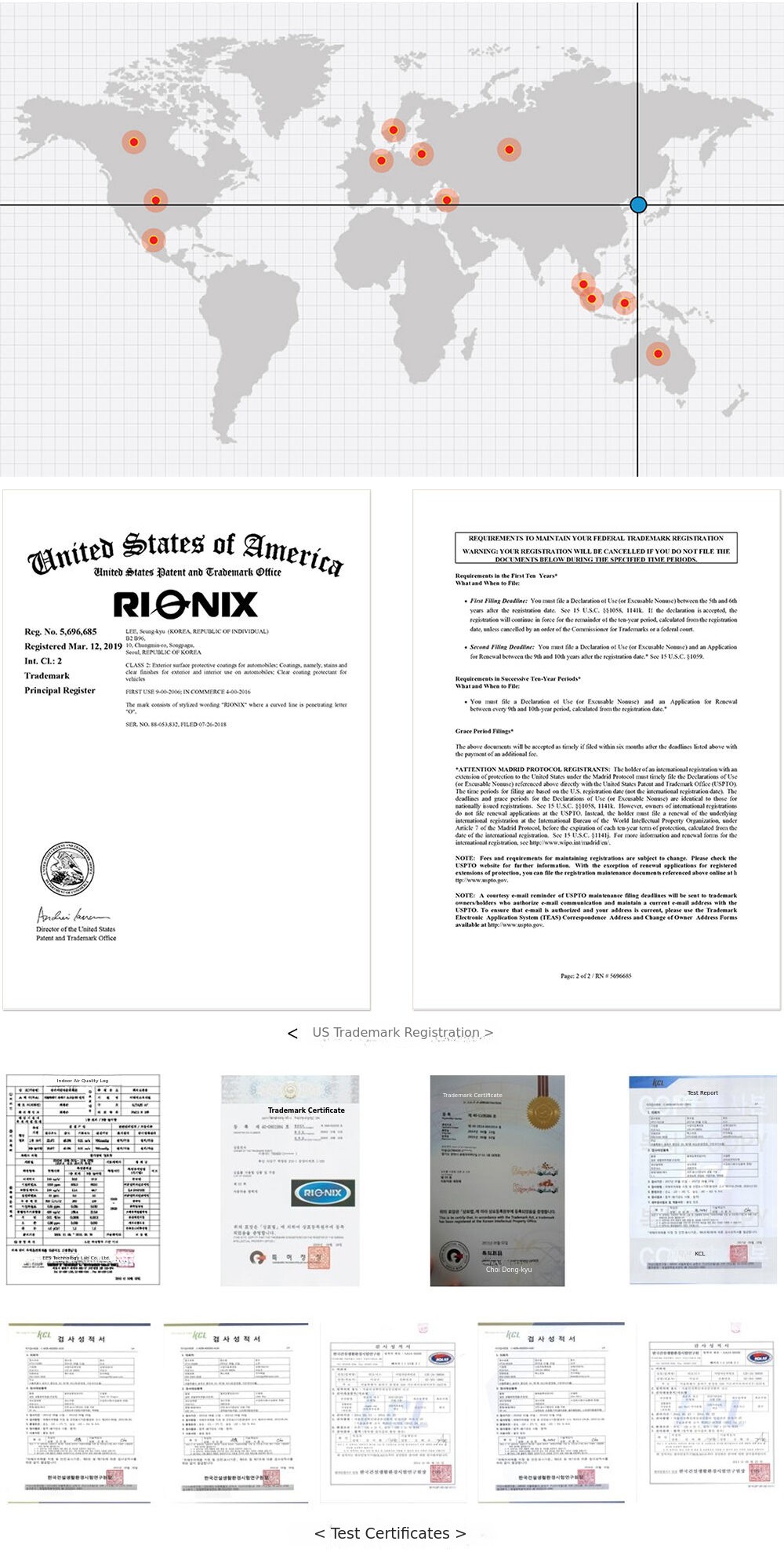 Rionixstarted in 2006 by applying metal titanium nano technology toautomotive coatings as its initial focus,and through the efficient use of nano materials, we have specialized in the research and development of various surface treatment chemical products, and through the production of diverse products, we are currently exporting to more than 10 countries.We are a specialized surface treatment technology brand.