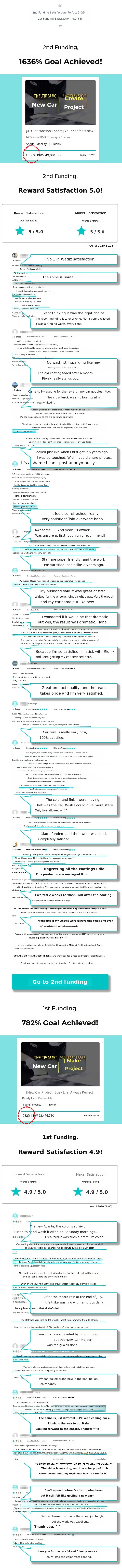 Reward compositionandvehicle model If they do not match,reservation is not possible.Be sure to check the vehicle model before selecting a reward. Please do not engage in illegal orVehicles that have been repainted without heat treatmentarenot eligible for coating.Be sure to check before proceeding with funding.