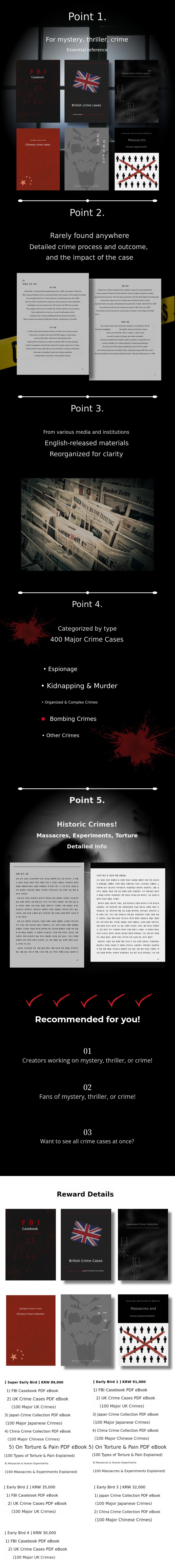 The highly popular e-books <FBI Casebook>, <British Crime Casebook>, <Japanese Crime Collection>, <Chinese Crime Collection>, <On Torture and Pain>, and <Massacres and Human Experimentation> have been compiled into one set to present deeper stories on Wadiz. Based on real cases and records, this collection is designed not only for creative activities such as mysteries and crime stories, but also to provide a unique enjoyment in everyday life.
