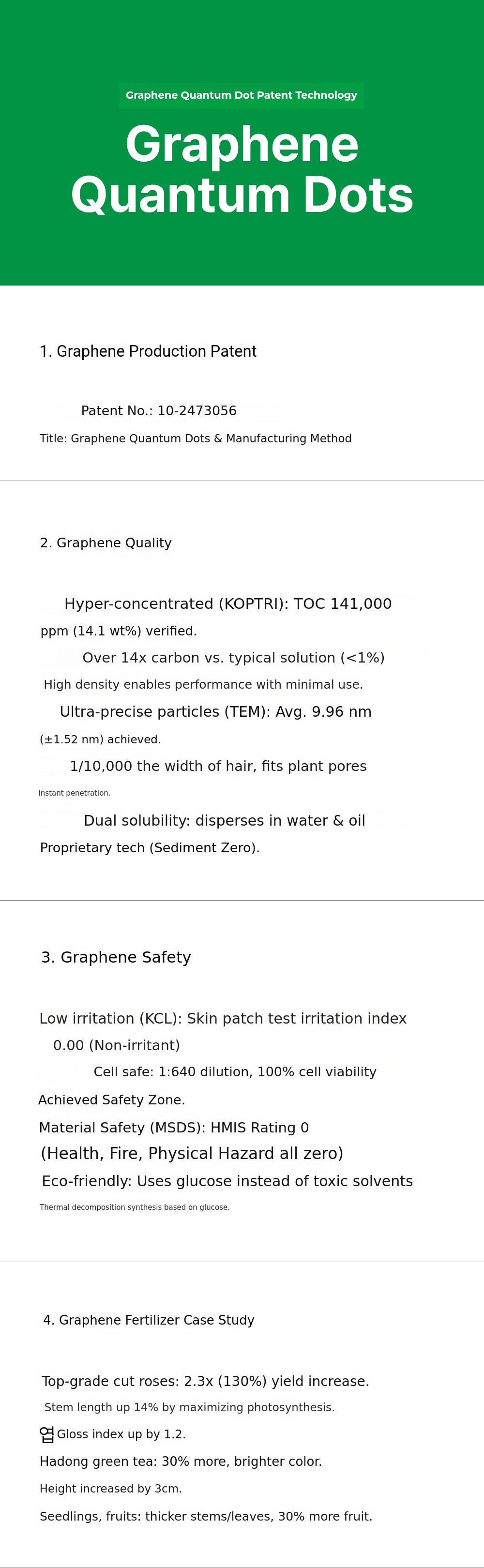 After confirming an overwhelming TOC concentration of 141,000 mg/L for graphene quantum dots (GQDs) at an accredited institution, we visited farms to distribute it, tried cultivating ourselves, and finally verified the nano-carrier effect of graphene quantum dots (GQDs).