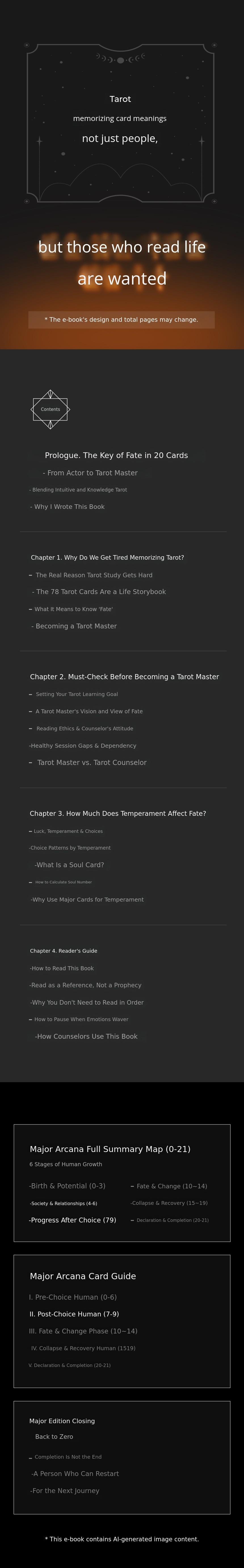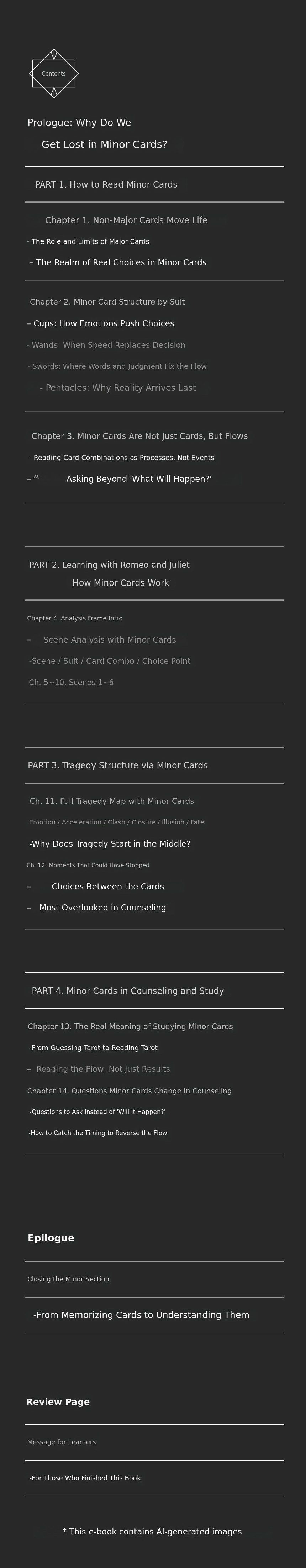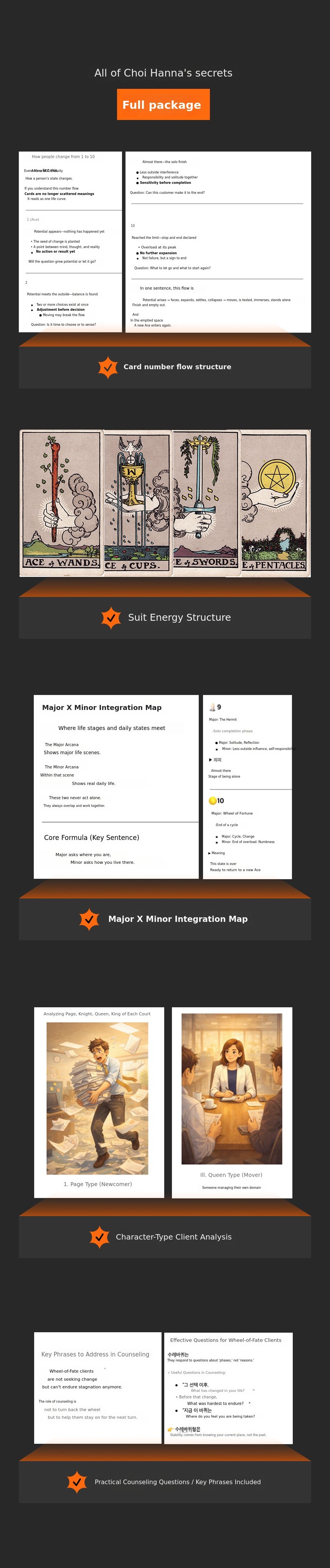 It includes multiple-choice and short-answer questions based on real counseling cases, as well as stories from 'World Classic Fairy Tales Learned Through Tarot.' You can practice connecting well-known fairy tales with tarot cards to identify the soul card and minor card of each character.