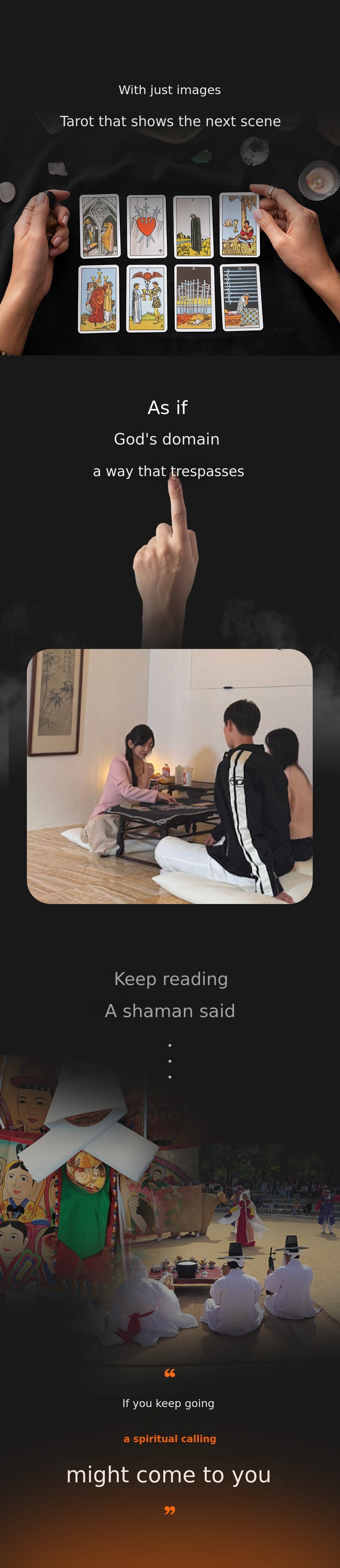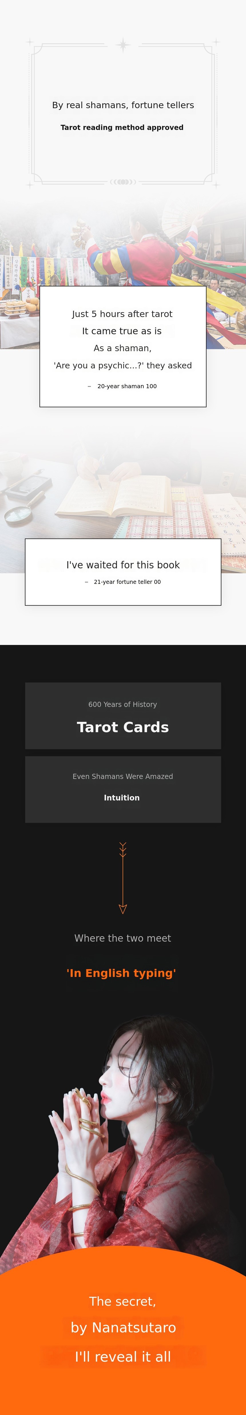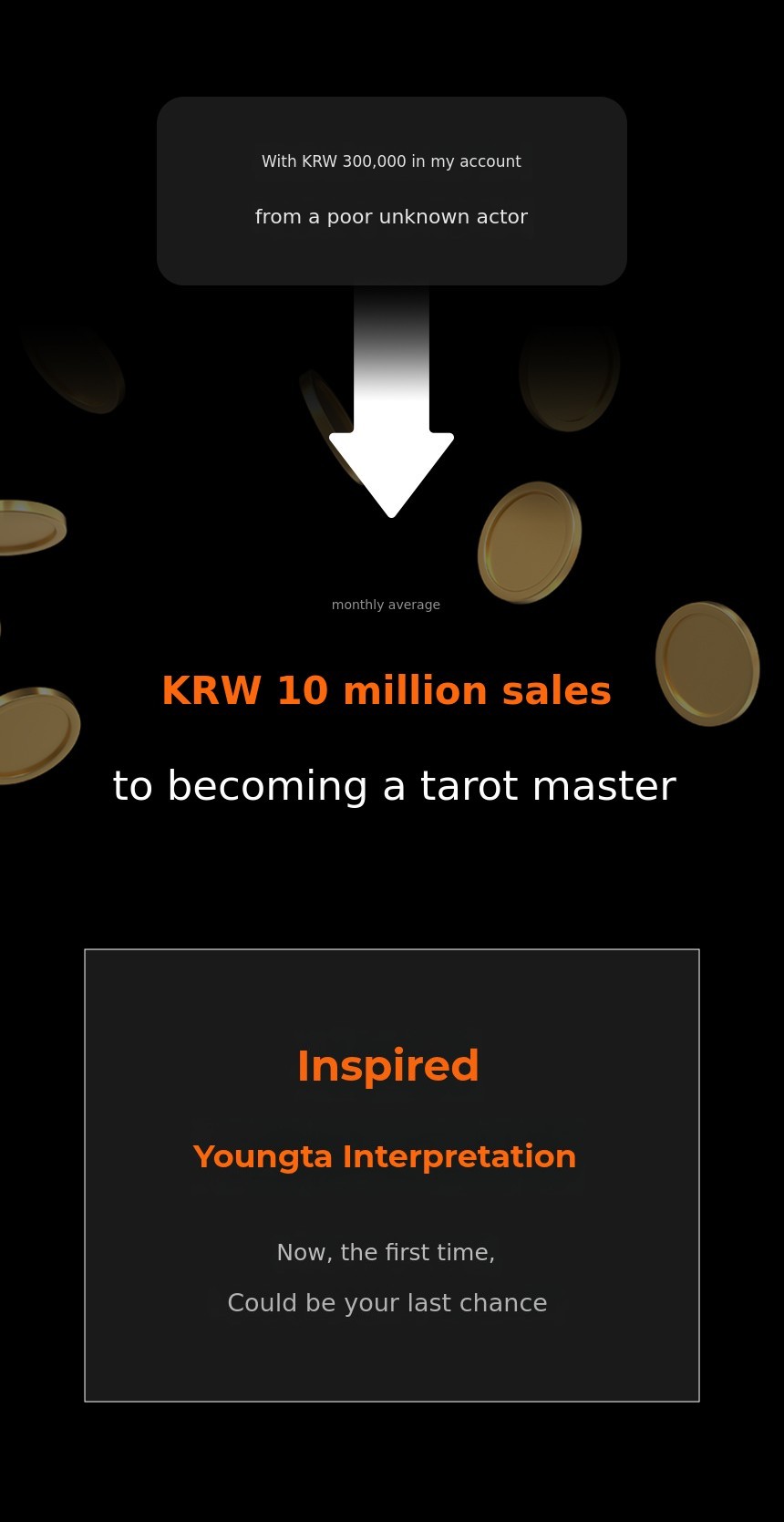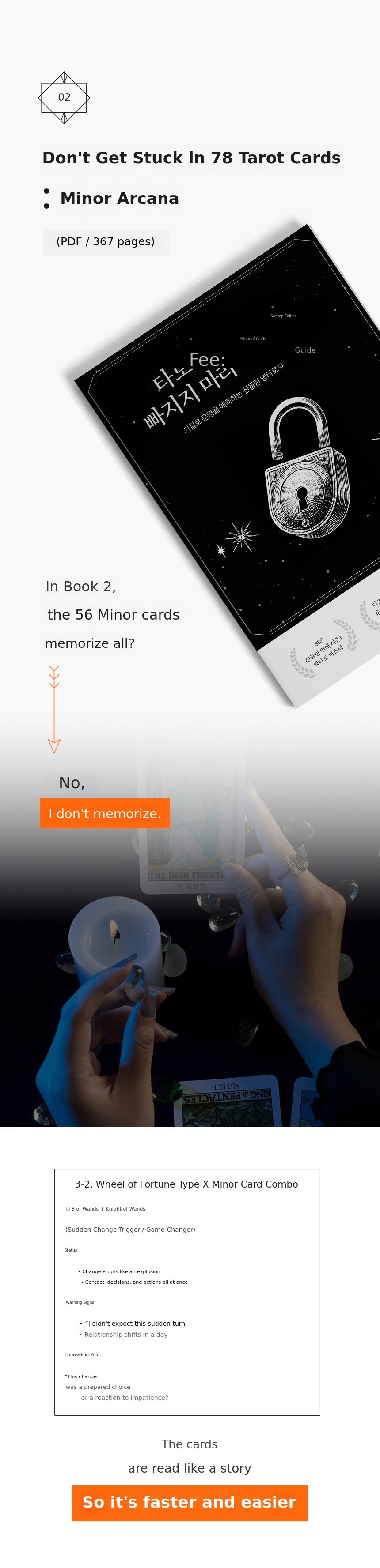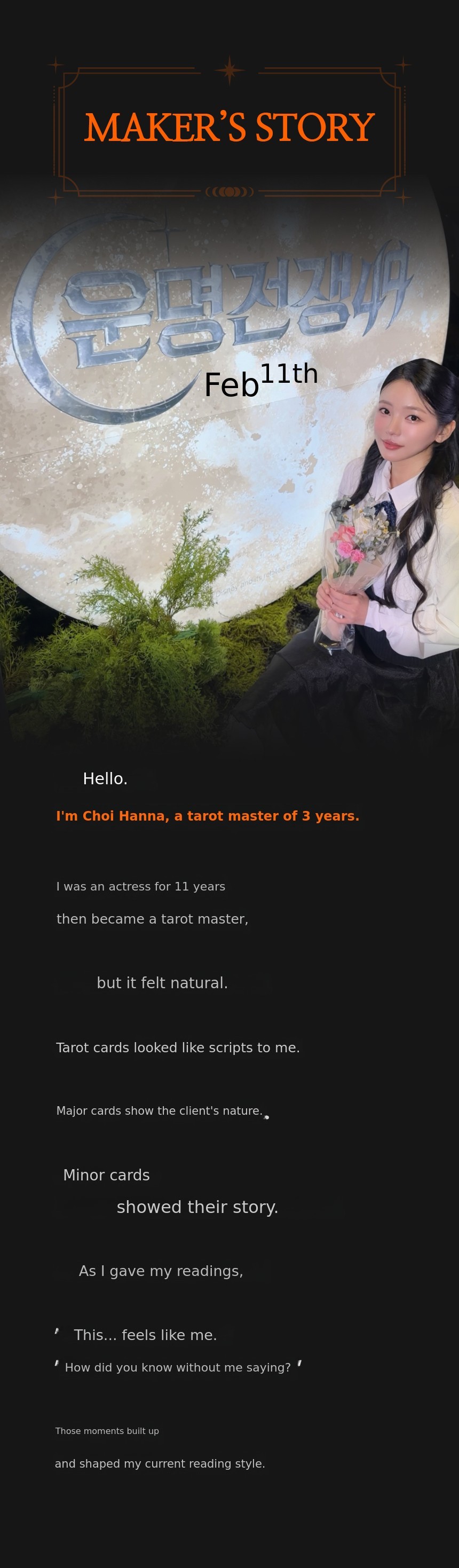 At 28, I ended my 11-year acting career. With only 300,000 won in my bank account, a used book bought from a secondhand market, and a pack of cards I got as a bonus. That was all I had to start. Without learning the keywords, I just looked at the pictures and imagined, and amazingly, I could read the cards. I found out later.That it was called 'Young Tarot'.