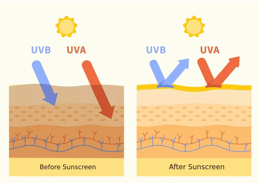 A. It is a chemical sunscreen. It adheres lightly to the skin, absorbs UV rays, and converts them into heat energy for protection.
