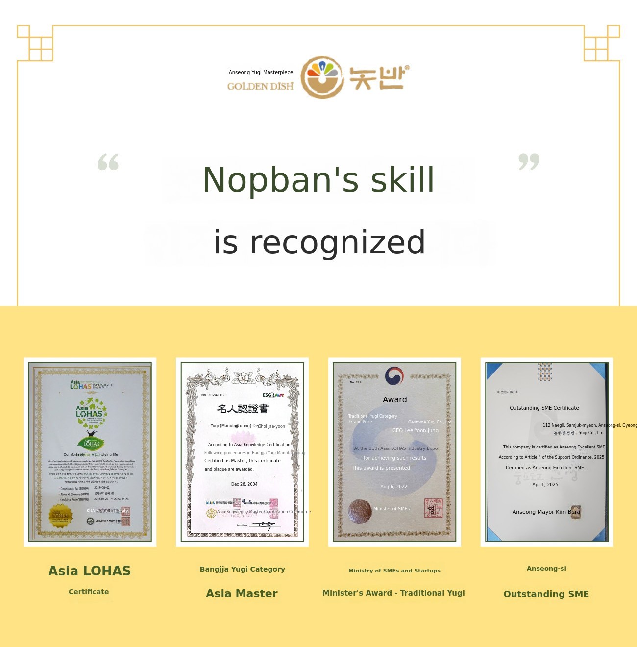 Notban is a representative Korean brassware brand certified by the nation, having been selected for Brand K, awarded the Minister of SMEs and Startups Prize, certified by Asia LOHAS, and designated as a root enterprise.