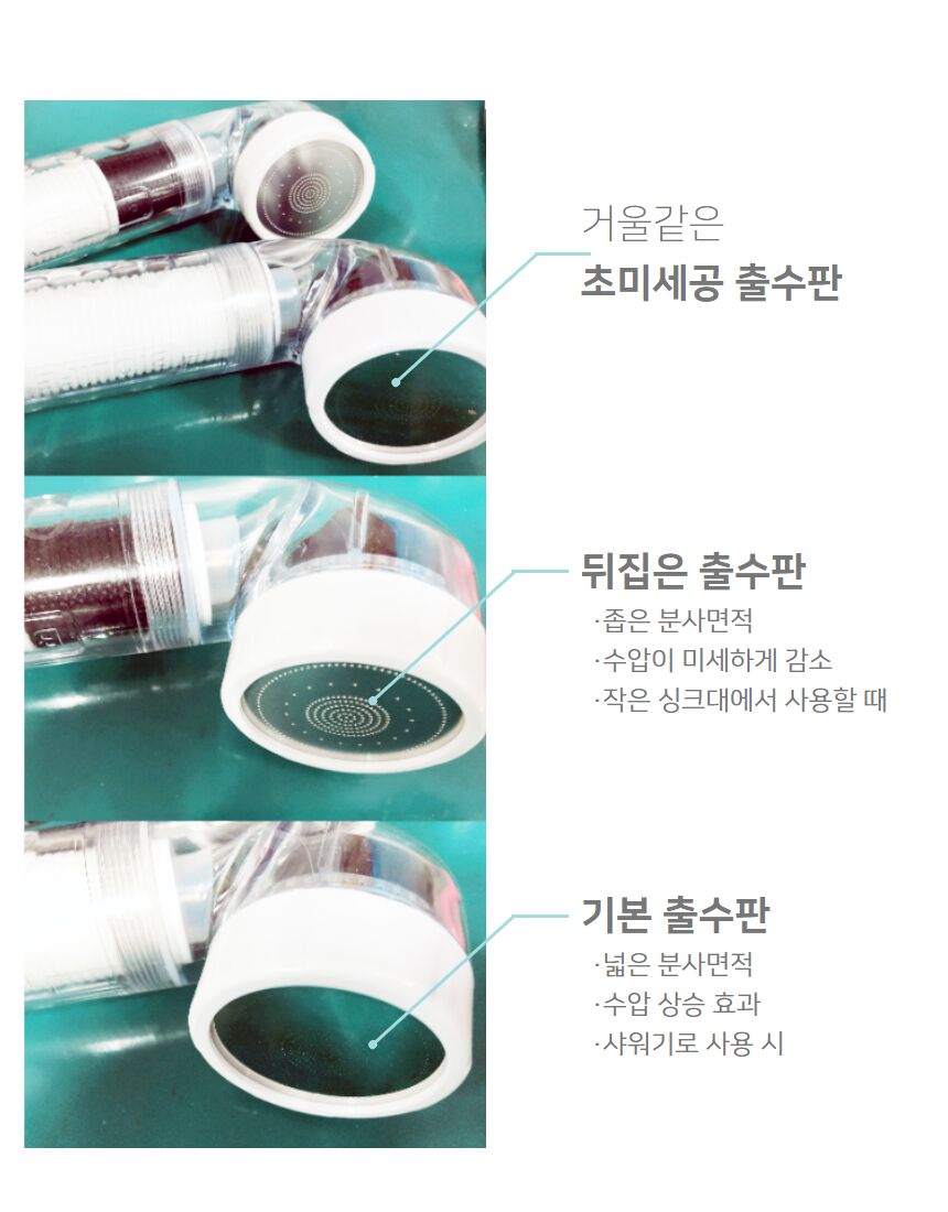 정수과정을 많이 거치게 될수록 수압이 약하게 느껴질 수 있습니다. 이런 문제를 보완하여 헤드의 크기를 작게, 길이를 짧게 한 닥터스킨과 요리수의 하우징을 개발하게 되었습니다. 초미세공 출수판에 의해 수압이 세지는 것이기에 극도로 낮은 수압의 경우에는 기본적인 내압이 적용되지않아수압상승 효과가 못 느끼실 수 있으니 이점 참고해주세요. 초미세공 출수판 or 수압상승 기능의 샤워기를 이미 사용하고 계시다면 수압의 차이를 못 느끼실 수 있습니다.