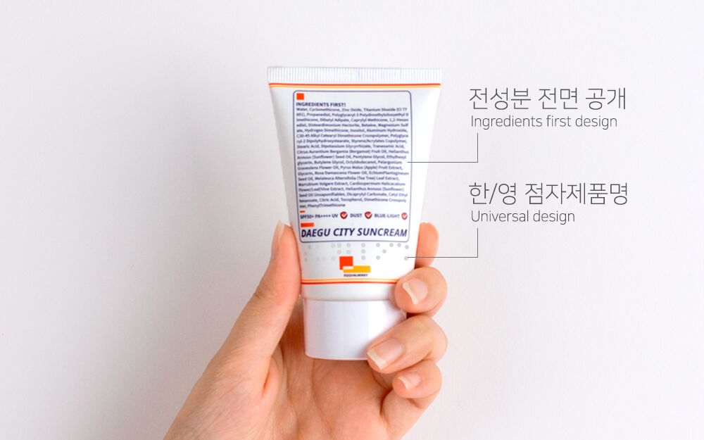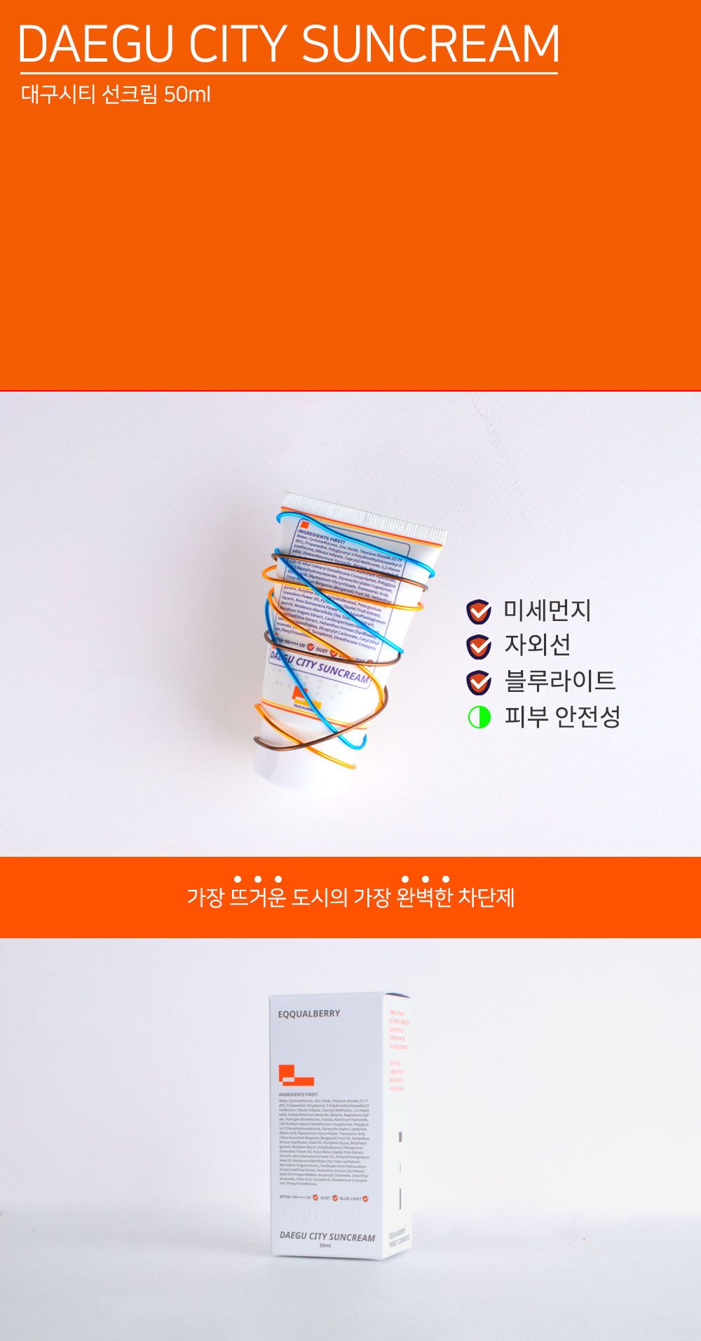 가장 뜨거운 도시를 컨셉으로 개발된 대구시티선크림은 가장 높은 수치의 자외선차단력(SPF50+/PA++++)과 오늘날 피할 수 없는 피부의 적, 미세먼지와 블루라이트를 함께 차단하는 365 외출필수품입니다