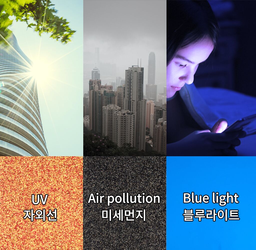 A: 자외선은 식약처 고시 기능성원료인 티타늄디옥사이드, 징크옥사이드로 피부 표면에서 물리적인 방식으로 자외선 피부 접촉을 산란시킵니다. 미세먼지는 CITYSTEM™이라는 특성원료로 미세먼지 모사체가 피부에 붙는 것을 방지합니다. 끝으로 블루라이트는 걱정에 비해 투과율이 낮아 자외선과 미세먼지를 차단하는 성분과 다른 성분들이 조합된 제품으로 충분히 차단할 수 있는 것으로 판단되어 한 가지 성분이 아닌 다중성분 복합체로 차단한다고 이해해주시기 바랍니다.