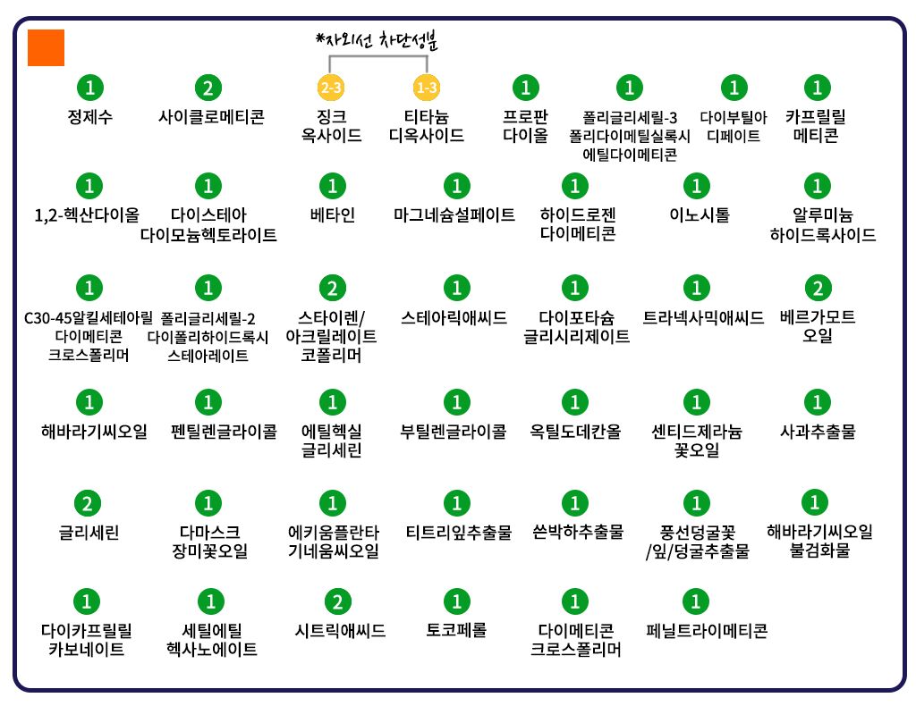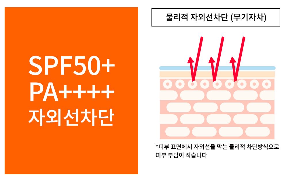 티타늄디옥사이드, 징크옥사이드 자외선차단 성분 2종은 무기자차(물리적자외선차단) 성분으로 미세한 입자로 피부 표면에 막을 형성해 자외선이 흡수되지 않게합니다. 피부자극과 눈시림이 적습니다.