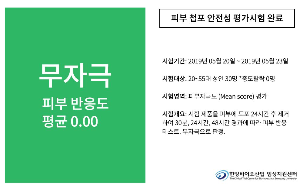 피부 첩포에 제품을 바른 후 30분/24시간/48시간 경과 테스트 후 평균 피부 반응도 0.00으로 '무자극' 판정을 받았습니다.