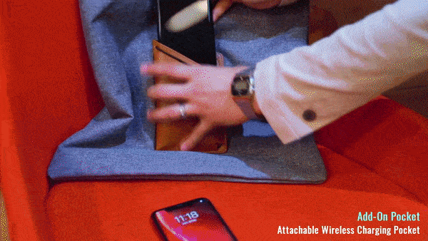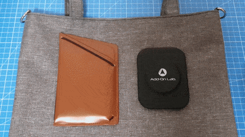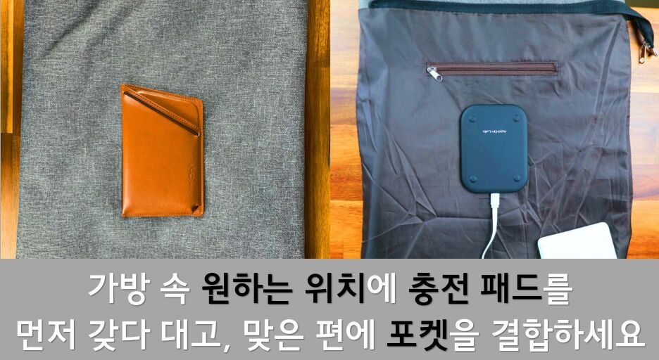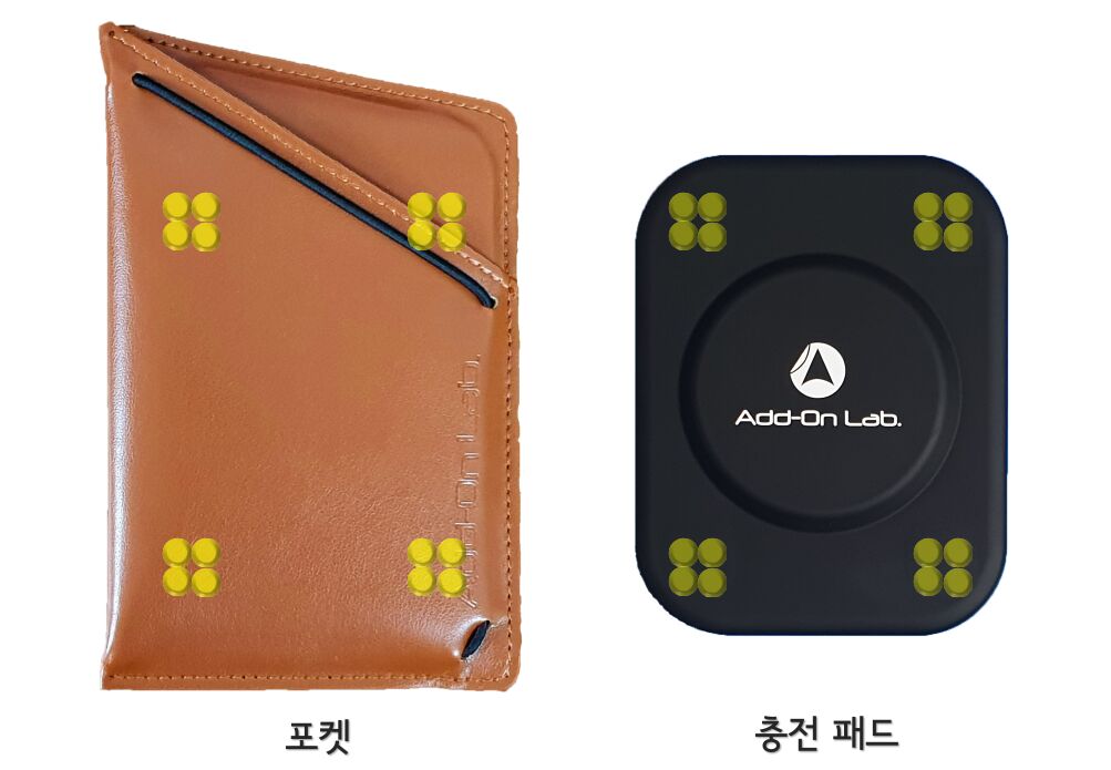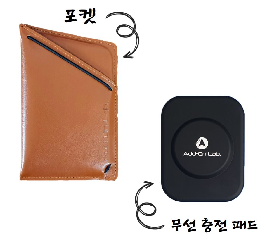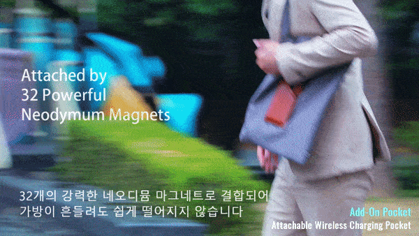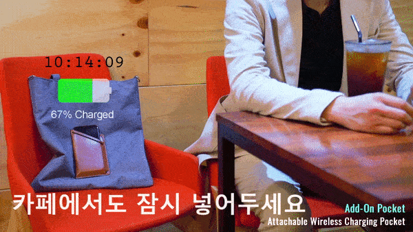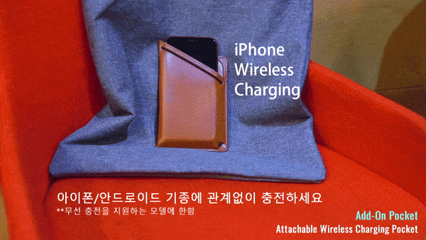 애드온 포켓의 사용 방법은 매우 간단합니다. 충전 신호를 발생 시켜주는 '무선 충전 패드' 와 스마트폰을 편리하게 보관해 줄 '포켓'. 이 두가지를 자력으로 '착~!' 하고 붙여주기만 하면 가방에 장착이 됩니다.