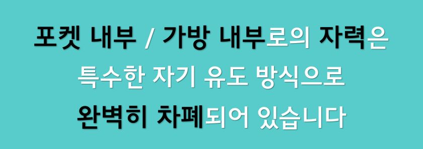 - 포켓 내부와 가방 내부로는 자력이 완벽히 차폐되어 스마트폰과 가방안 소지품에 영향을 주지 않습니다.
