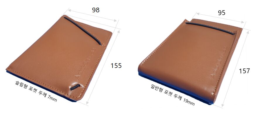 - Slim 타입 포켓은 최대 9mm 두께를 삽입 가능하므로 케이스 장착시 핸드폰이 들어가지 않습니다. (케이스 사용시 Normal 타입 포켓을 펀딩해 주세요)