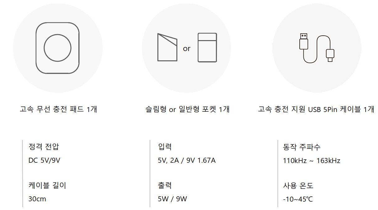 **고속 무선 충전을 사용하려면 9V / 1.67A 이상의 고속 충전 지원 보조 배터리 또는 어댑터를 사용해야 합니다. (QC2.0 이상 필요. 배터리 및 어댑터는 구성품에 포함되지 않습니다)