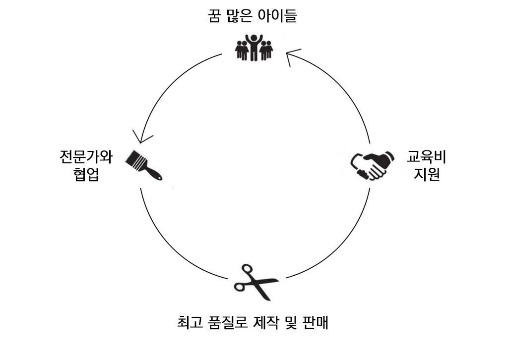 저소득층 아이들이 자신들이 정해놓은 틀을 부수고 나와서 자신들은 무엇이든 할 수 있고 가능성이 충만한 아티스트이고 자신은 소중한 존재라고 스스로 깨닫을 수 있는 과정을 제공하는 것에 있습니다. 아이들과 함께 그림을 통하여 자신감을 찾고 자신의 희망과 가능성에 대하여 표현하는 수업을 합니다. 그 활동에서 아이들에게 사소한 성공의 기회를 계속 심어 줍니다. 이러한 일련의 과정을 통해서 아이들은 자존감을 높이고 본인이 무엇이든 할 수 있는 존재라고 믿게 됩니다. 그런 활동을 통해서 나온 결과물인 그림으로 제품을 만들어서 많은 사람들에게 펀딩하면 아이들은 자신이 그린 그림이 멋진 리워드가 되어서 많은 사람들한테 펀딩 되는 것에 신기해하며 자신이 이룬 가시적인 성과에 자존감이 올라가고 자신감이 쌓입니다.