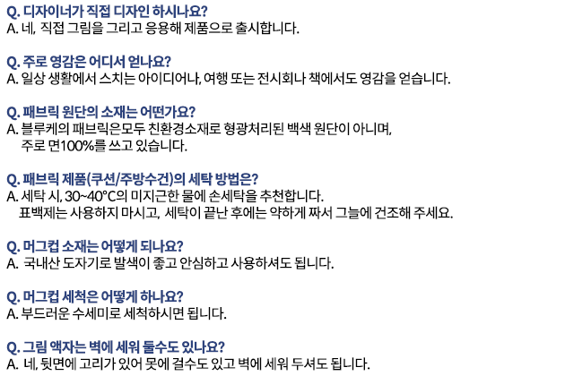 소재는 우리 주변에서 흔히 보는 풍경과 순간의 편린에서 얻고 있습니다. 여행에서 좋았던 추억들이나 특정한 장소에서 받은 영감에서 디자인은 탄생합니다. 누구나 접할 수 있는 우리만의 문화와 스타일이 살아있습니다.