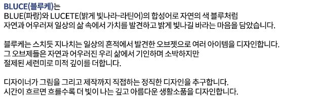 블루케는 우리만의 스타일로도 얼마든지 좋은 제품을 만들 수 있다는걸 보여주고 싶습니다. 쉽게 흉내 내지 않는 정성들여 사물을 관찰하고 응용해 어디서도 볼 수 없는 독창적인 디자인을 추구하고 있습니다. 정직한 디자인, 아름다운 디자인을 위해 노력하고 있습니다.