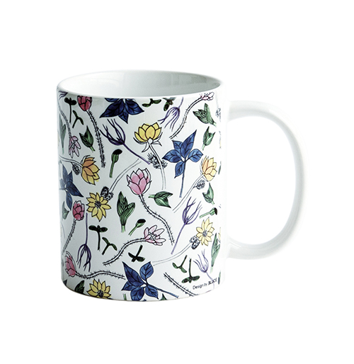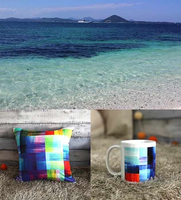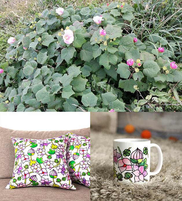제주도 용머리해안 근처에서 본 이름 모를 꽃으로 디자인한 쿠션과 머그컵입니다. 어디서도 볼 수 없는 손 맛이 느껴집니다.
