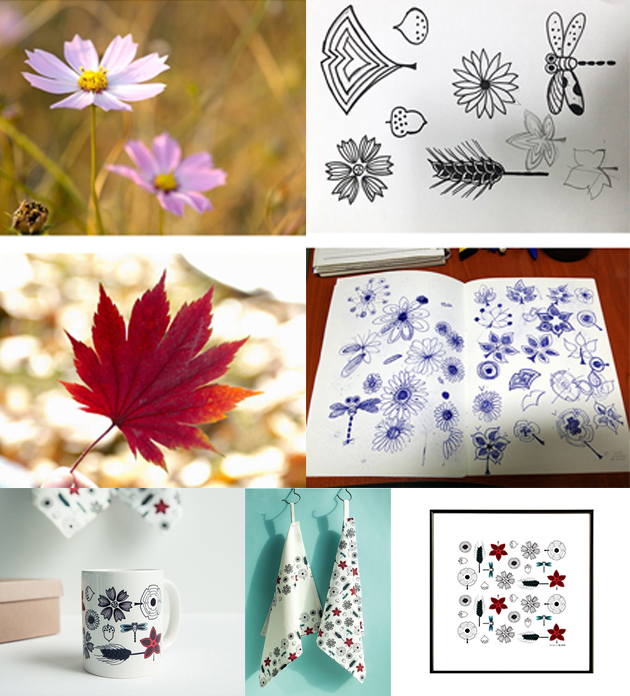 은행잎, 잠자리, 코스모스, 국화, 보리, 단풍잎, 도토리, 밤 등 여러번 스케치를 거져 패턴을 완성한 후 여러 제품에 응용하였습니다. 꾸준히 반응이 좋은 제품군입니다.