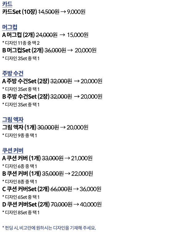 직접 그린 그림과 응용물로만 제품을 만들고 있습니다. 블루케만의 독창적인 디자인이 있고 그 적용범위는 무궁무진합니다. 지금은 쿠션과, 머그컵, 그림액자, 주방수건, 카드, 노트 등을 제작하고 있습니다. 앞으로 더 많은 제품에 적용할 예정입니다.