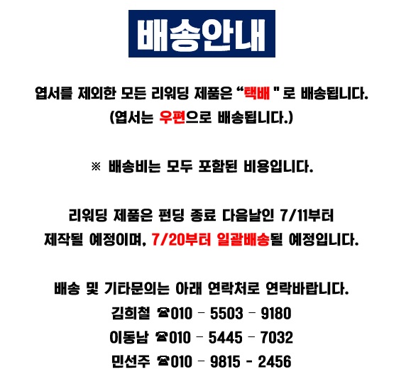 리워딩 제품이 7월 11일부터 제작될 예정이라고 명시되어 있는데, 제품 생산 업체와 예산 상의 문제로 예정 제작일보다 늦어지게 된 점 알려드립니다.