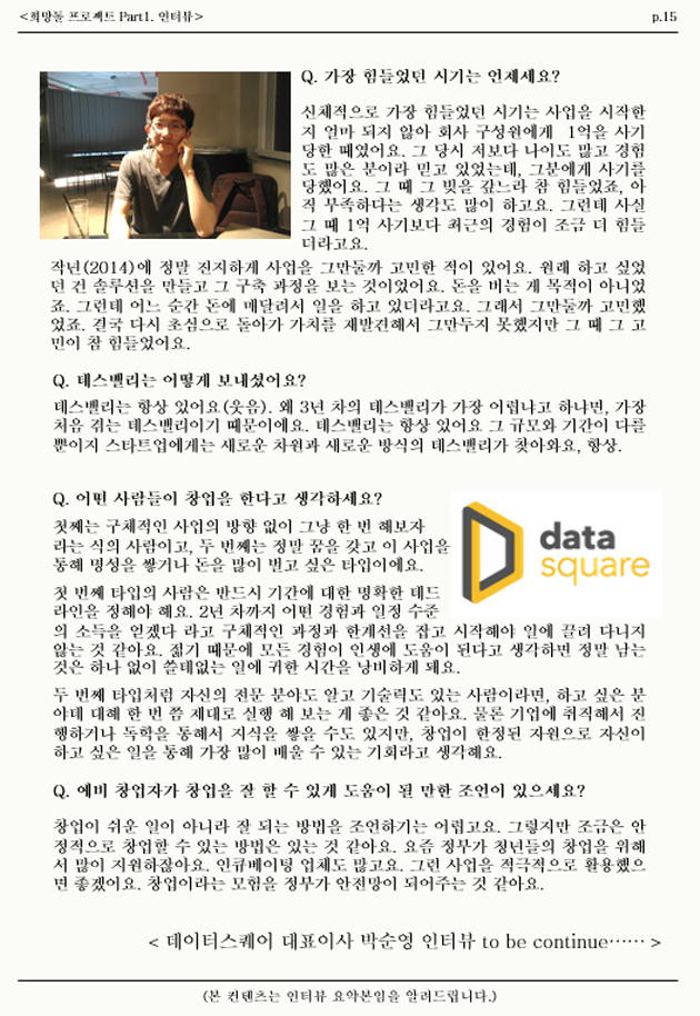 이 안타까운 현실을 저희들은 계속해서 고민해 왔습니다. 창업 준비를 하기에도 모자란 시간이지만, 누군가는 이 부분에 대해 도움을 주어야 한다고 생각했습니다. 그래서 잠시 창업 준비를 중단하고, 우리보다 한 발 앞선 청년 창업가들을 직접 찾아가 이야기를 들어보기로 했습니다.