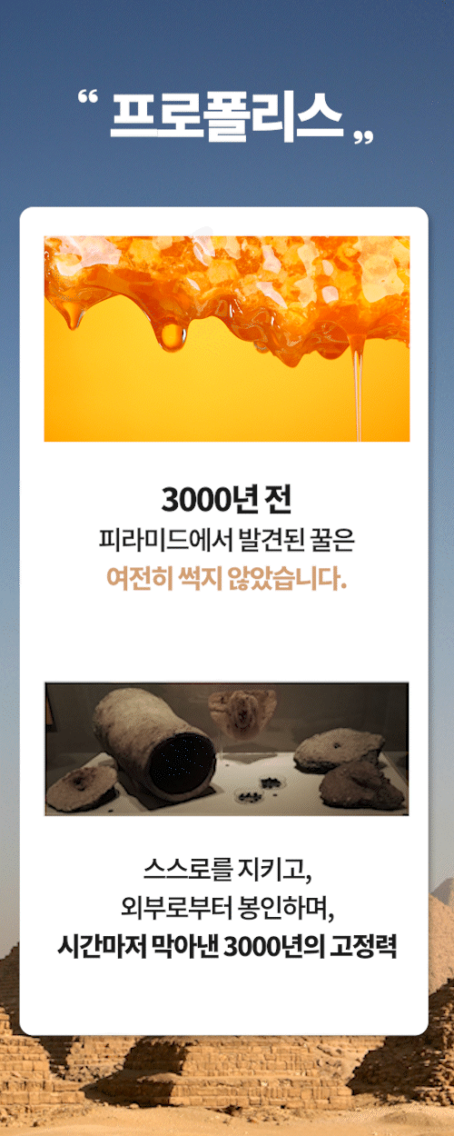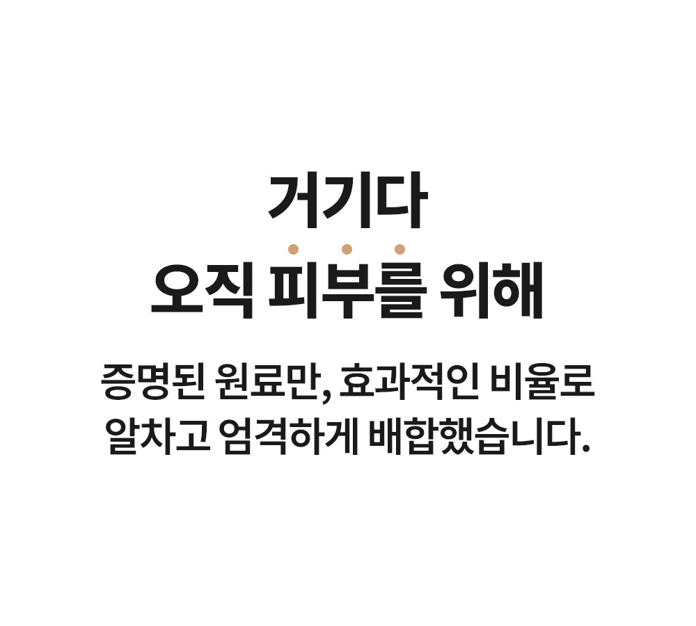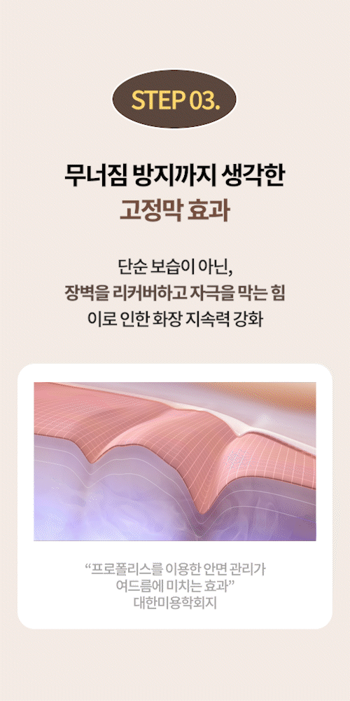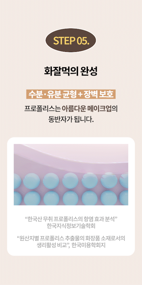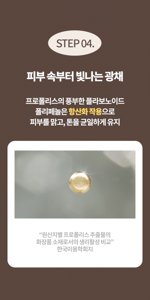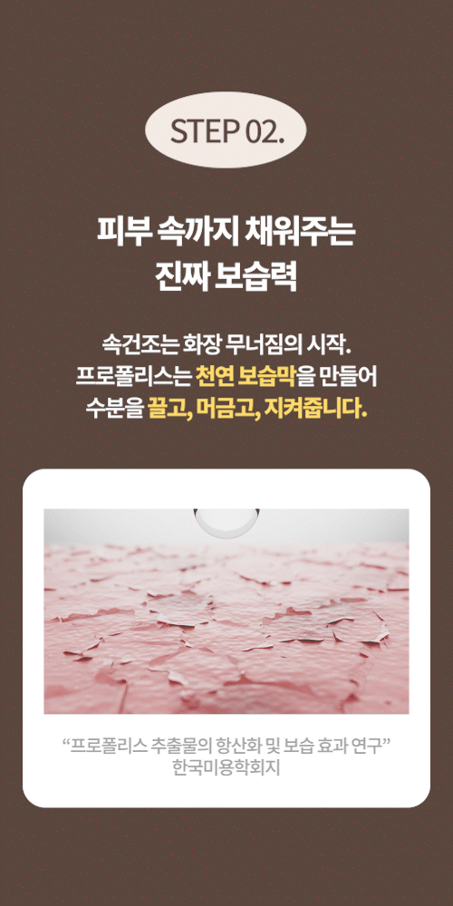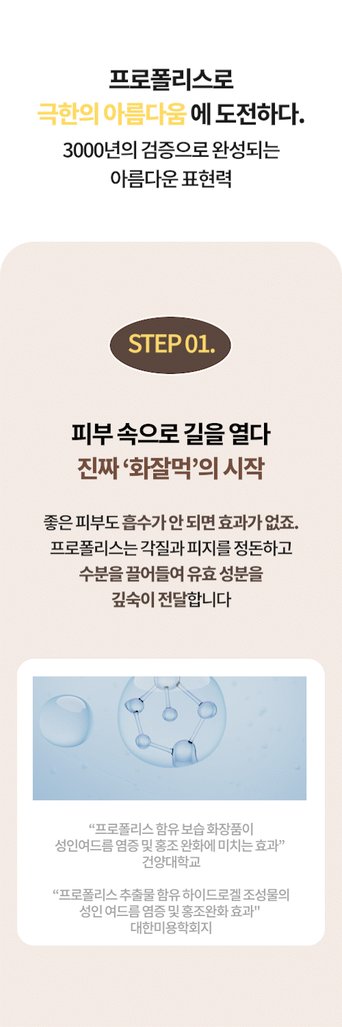 프로폴리스, 고보습 성분, 천연 유래 추출물 등 피부 본연의 컨디션을 끌어올리는 핵심 성분들로 구성했습니다.