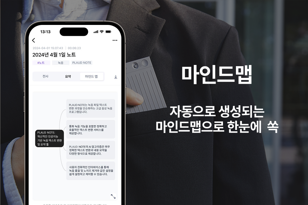 전화, 회의록, 강의 노트, 인터뷰, 핵심 요약, 보고 회의, 토론, 과제 부여, 컨설팅 등 총 9개의 사전 제공되는 템플릿에 따라 주제에 따라 보다 정확한 요약을 생성하여 보다 효율적인 작업을 지원합니다. 함께 생성되는 마인드맵을 통해 시각화된 요약 정보를 한 눈에 볼 수도 있습니다.