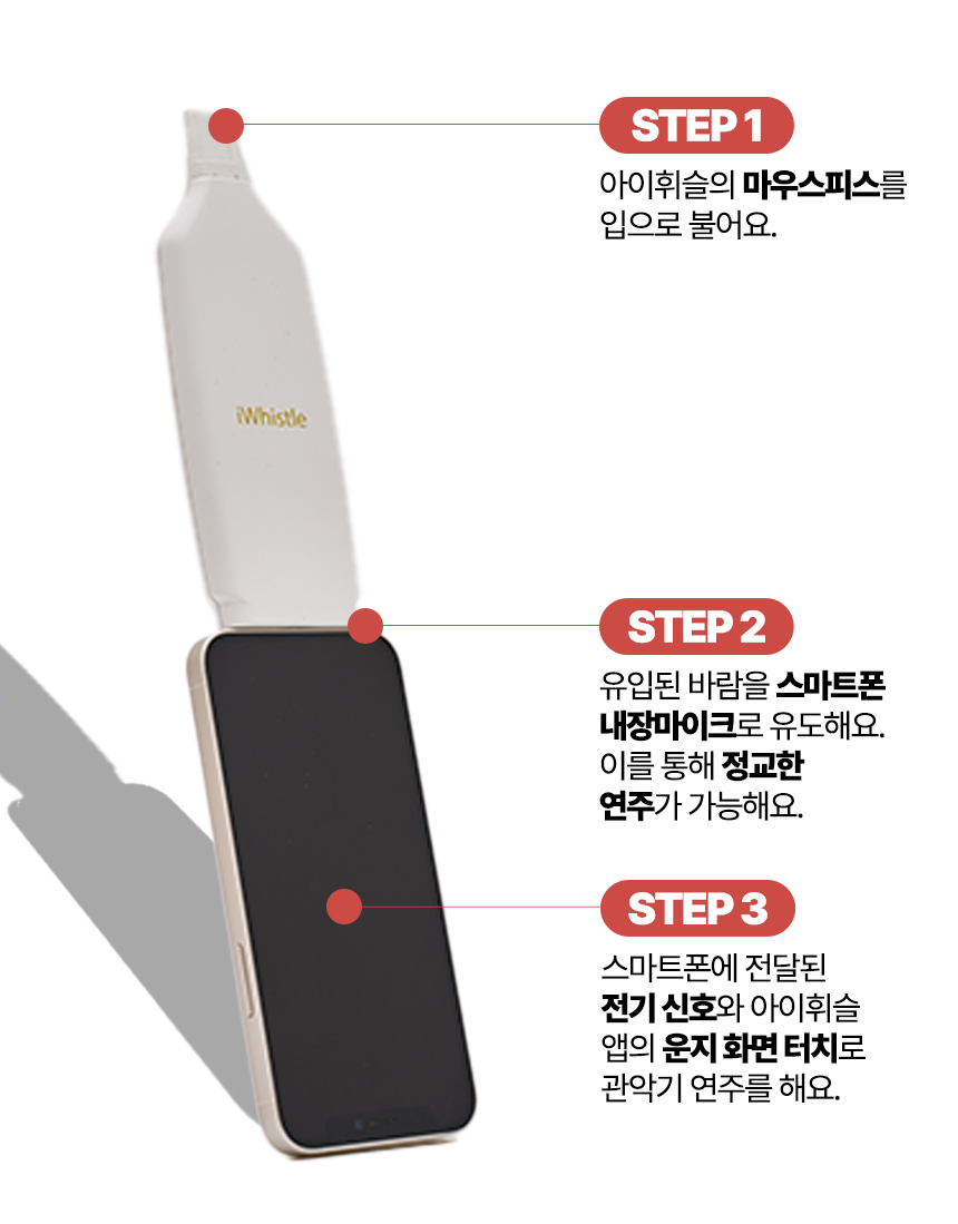 2012년, 아이폰에서 오카리나 앱을 처음 보았을 때, 신세계를 발견한 듯 했습니다. 그동안 여러 가지 악기를 배워보겠다고 노력했지만 제대로 연주할 수 있는 게 없었습니다. 시간이 없고, 어렵고, 재미없는 게 이유였습니다. 그런데 스마트폰 앱에서 제공하는 간단한 운지법으로 동요와 가요는 물론 그 어렵다는 클래식 음악까지 연주한다는 게 신기하기만 했습니다. 한동안 꿈에 부풀었지만 거기에도 문제는 있었습니다. 스마트폰 내장 마이크 언저리에 대고 바람을 불어 넣어서 연주를 해야 하는데 이게 보통 문제가 아니였습니다. 노래 한 곡을 연주하고 나면 맥이 빠져서 다음 곡 하기가 힘이 들었습니다. 바람이 삼지사방으로 다 빠져 나가고, 바람을 마이크에 정확하게 불어넣는 것은 마술에 가까웠습니다. 그래서 내장 마이크에 바람을 원활하게 불어넣을 방법을 연구하다가 책상 서랍에 있던 색소폰 마우스피스를 떠 올렸습니다. 이 마우스피스를 스마트폰에 연결하면 되겠다는 생각을 한 것이죠.