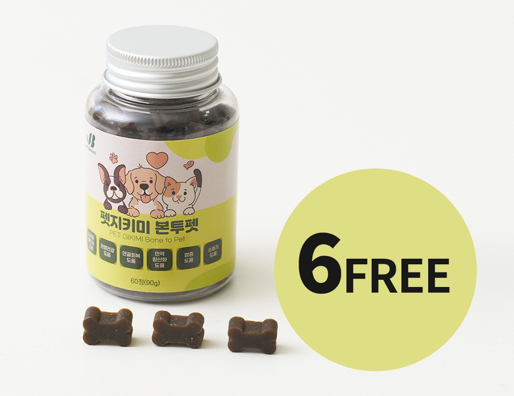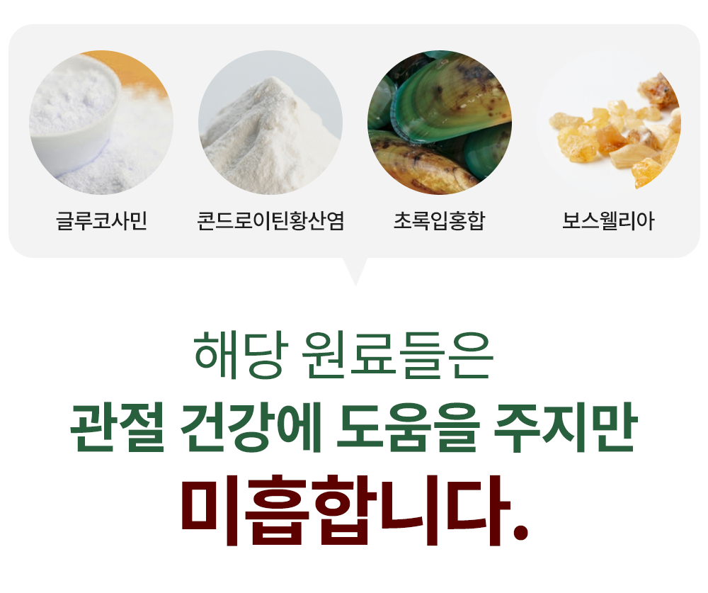 위와 같이 시중에 판매되는 관절 제품들의 원료들은 관절 건강에 도움을 주지만 미흡하고, 위 원료들은 면역력이 약해진 반려견에게 장기간 복용을 할 경우 부작용이나 알레르기를 유발하기 때문에 장기간 복용하는 것을 피하는 것이 좋습니다.