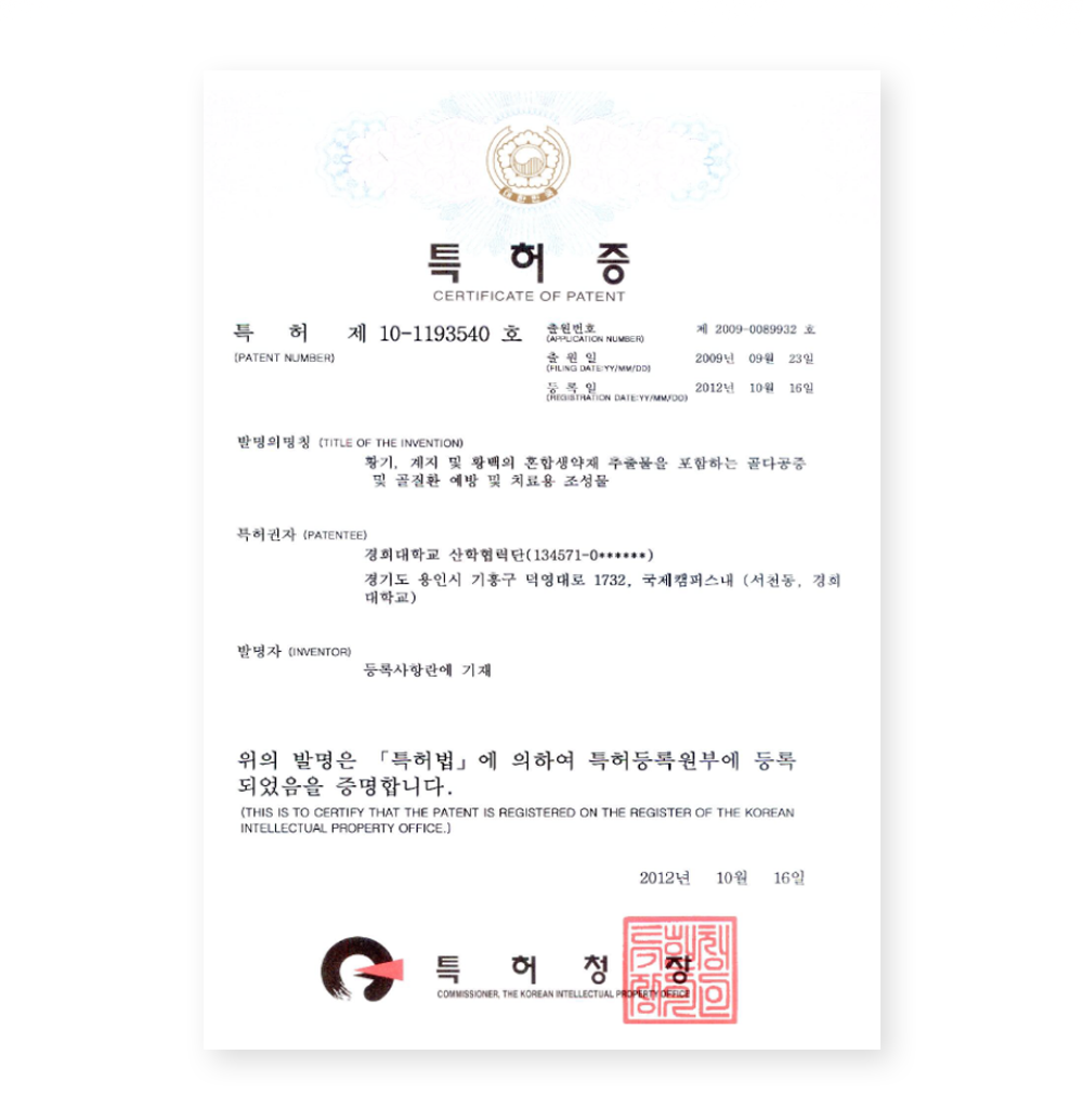 각 전문가들이 모여서 만든 특허원료로 국내특허, 국제특허(미국, 중국)까지 받았습니다