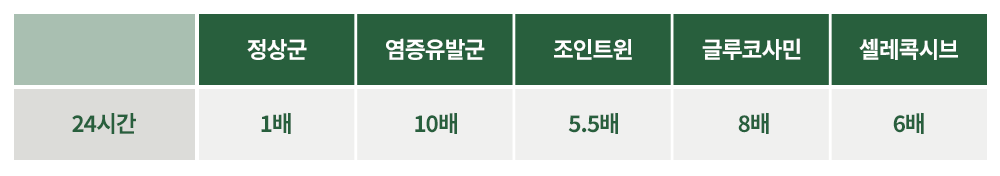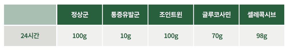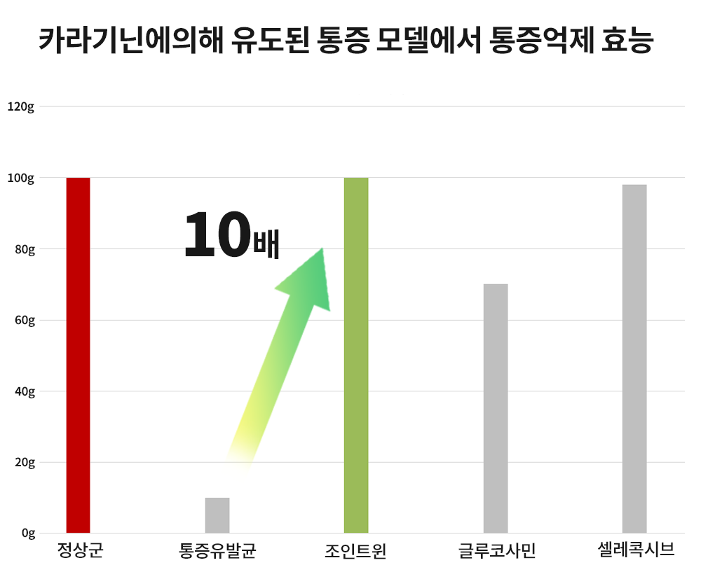 카라기닌에의해 유도된 통증모델에서 조인트윈(WIN) 섭취 그룹은 정상군처럼 통증억제 효능을 보였으며,글루코사민, 셀레콕시브 대비 가장 우수한 통증억제 효능을 보임