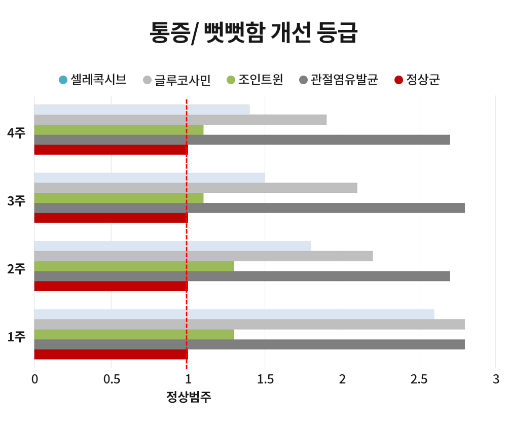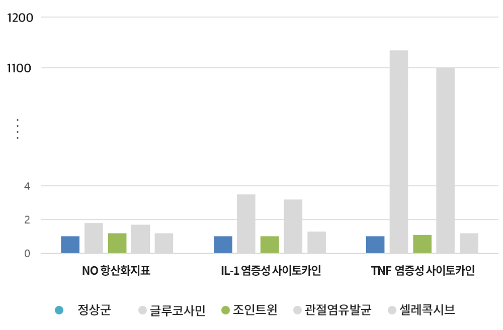관절염 모델에서 조인트윈(WIN) 3주 섭취 후 통증/뻣뻣함이 정상군으로 개선되었고, 글루코사민, 셀레콕시브 4주 섭취 후에도 정상군으로 회복되지 못함